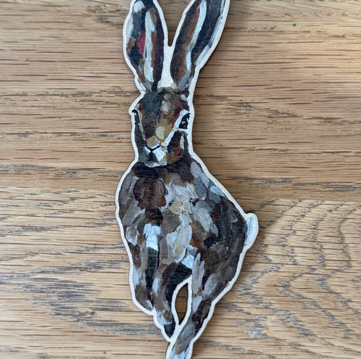Wooden magnet with hare design from original artwork. The hare is running towards you in this design.