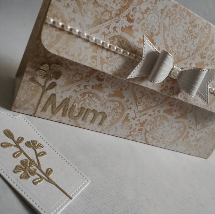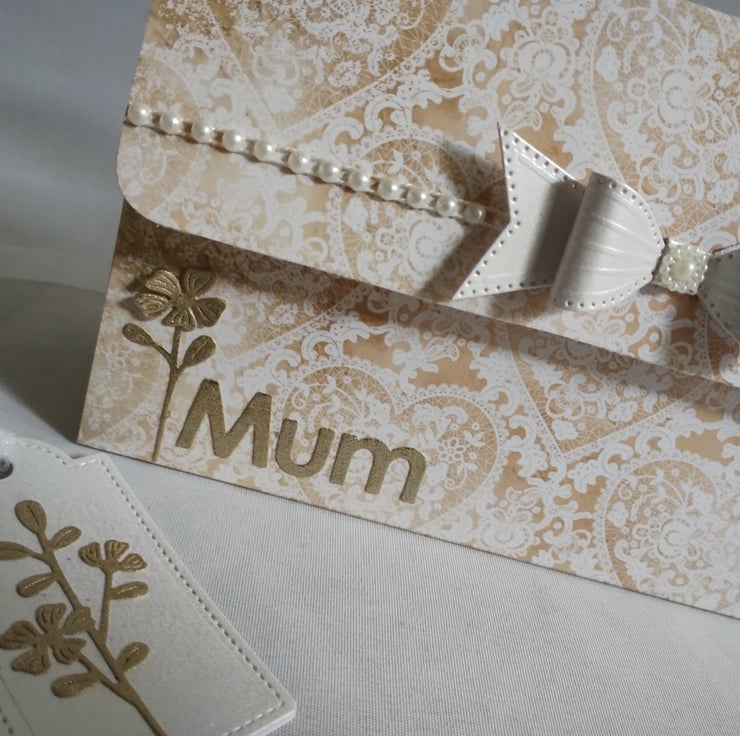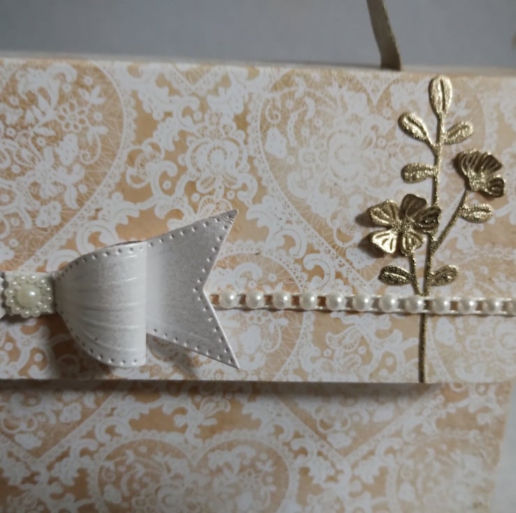 I've cut some pretty flowers from the golden paper and layered the petals to give a tiny bit of dimension. Across the front flap I have added a line of pretty flat-backed 'pearls' and and stunning pearl white cardstock bow.