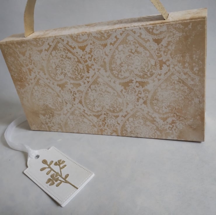 I've made this beautiful box from premium quality lacey heart patterned cardstock so its robust and made to last. The sides and handle are made from a gorgeous flexible golden paper which enables this box to fold flat for postage to keep postage costs down.