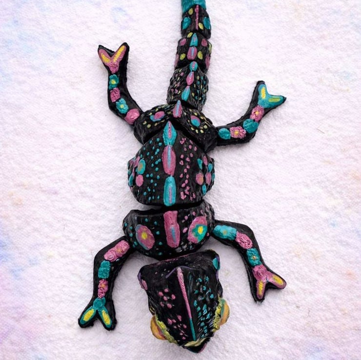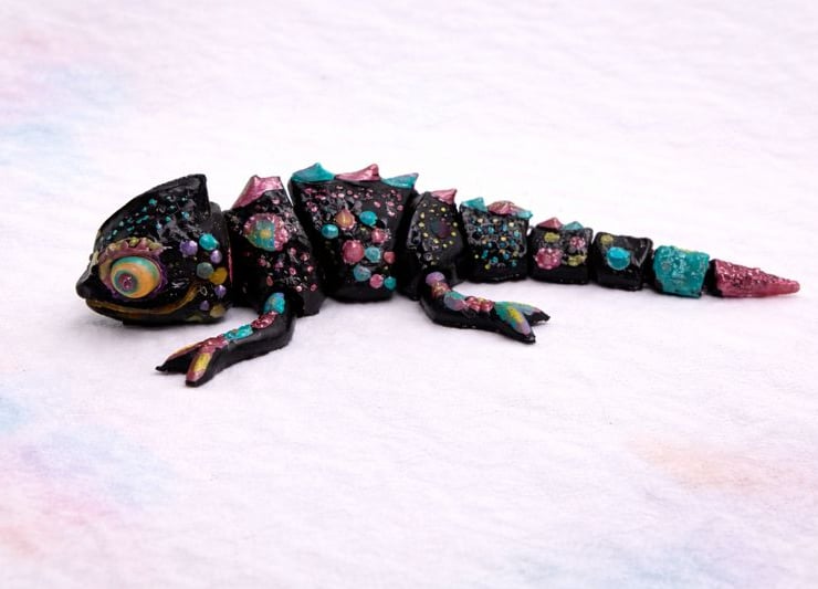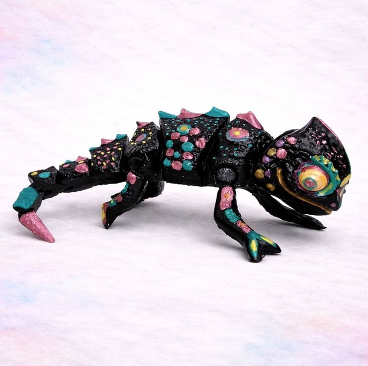 The articulated design allows the chameleon to be posed naturally, making it ideal for display on desks, shelves, or within collections. After printing, the model is hand-finished and painted, highlighting surface detail and texture for a bold, eye-catching result. No mass production, no shortcuts – each piece is individually handled from print to finish.