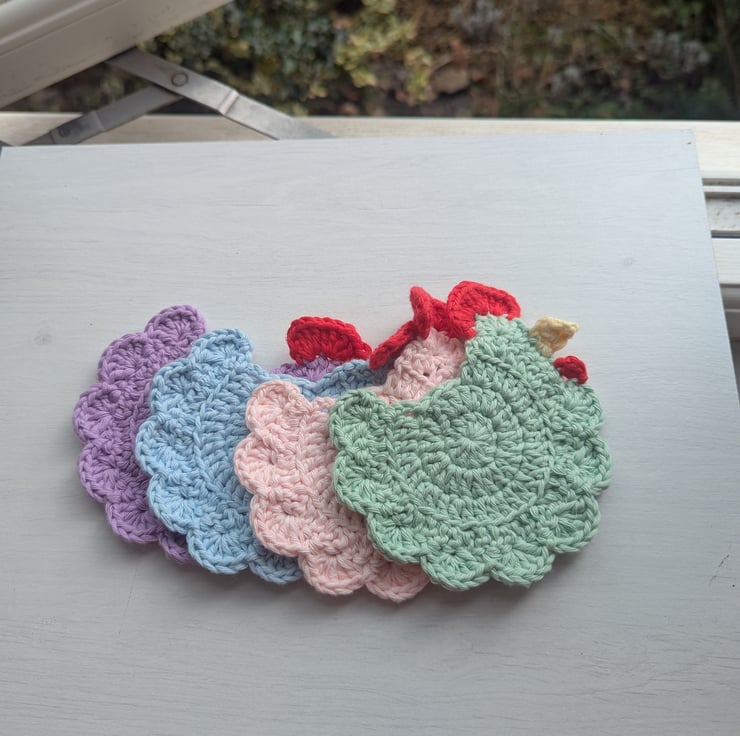 These cotton crotchet coasters are the perfect addition to you afternoon tea or coffee! The Perfect Pastels set includes green, blue, pink and purple, all perfectly complimentary of each other! Chicken coasters are the perfect country feel or a quirky conversation starter for you and your guests!