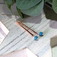 I have used 1.2mm copper wire and shaped into twisted loops. Inside the top section I have added silver pebbles, created by heating silver to melting point to where it forms a natural pebble and soldering this in place. Finished with sterling silver ear hooks