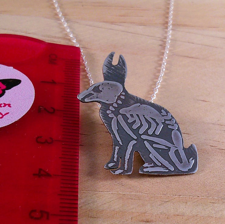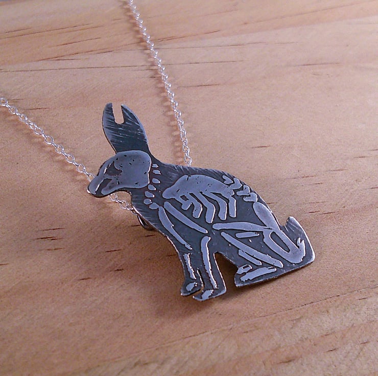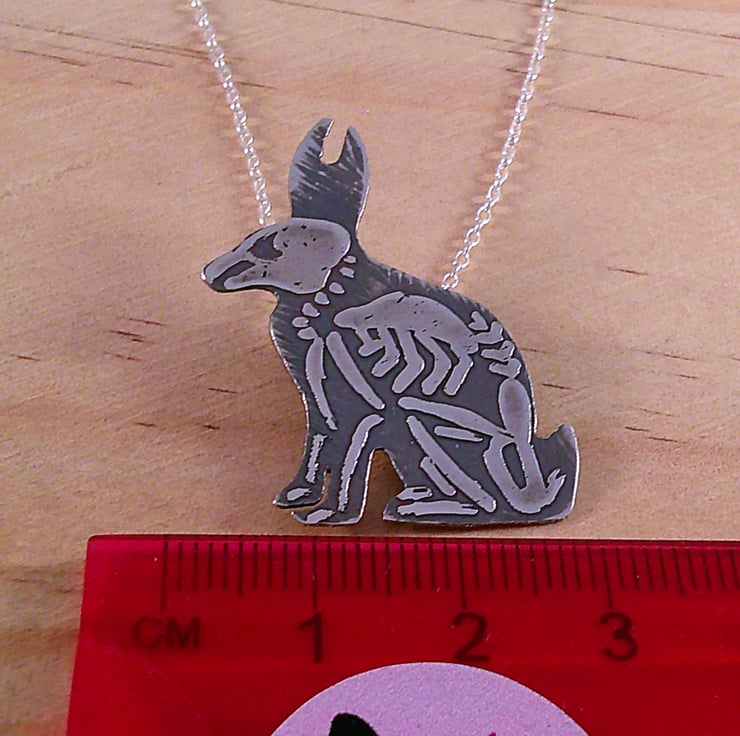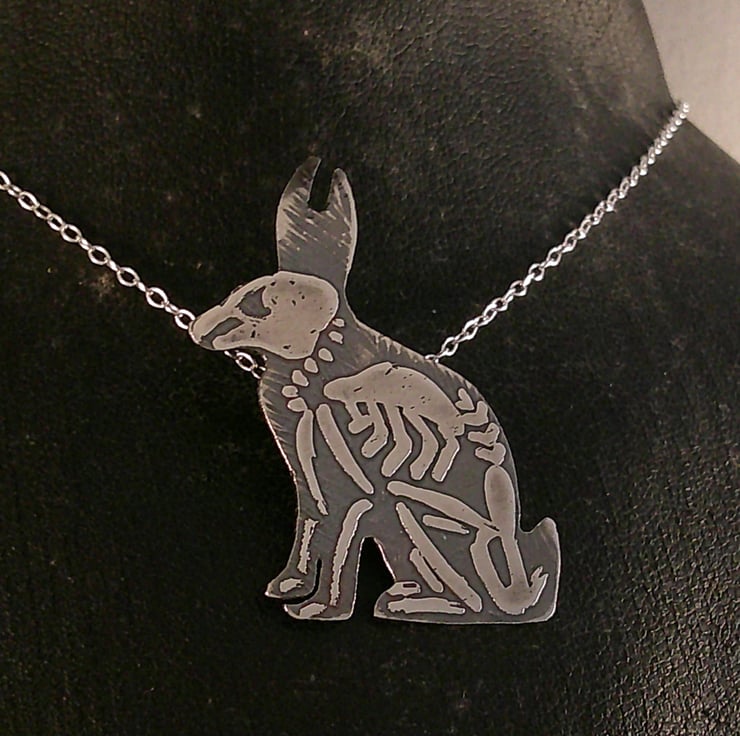 The shape of a seated rabbit has been hand pierced from a sheet of 100% recycled sterling silver. The skeleton details have then been hand drawn and etched. Two loops have been soldered to the back for the chain, and the necklace has been oxidised to blacken the etched details.
