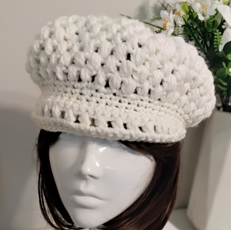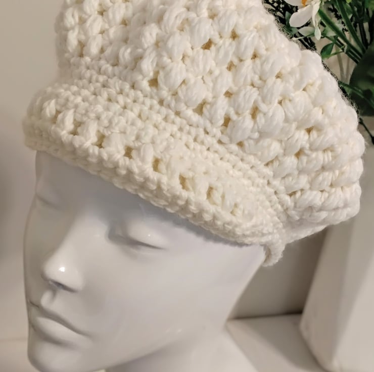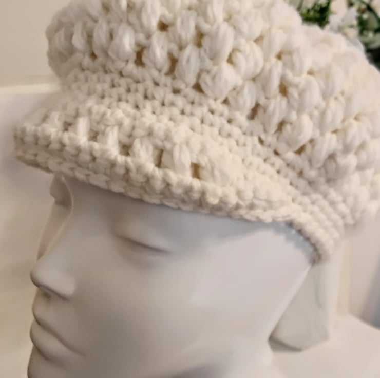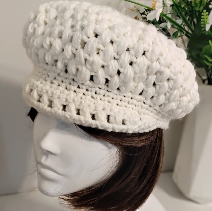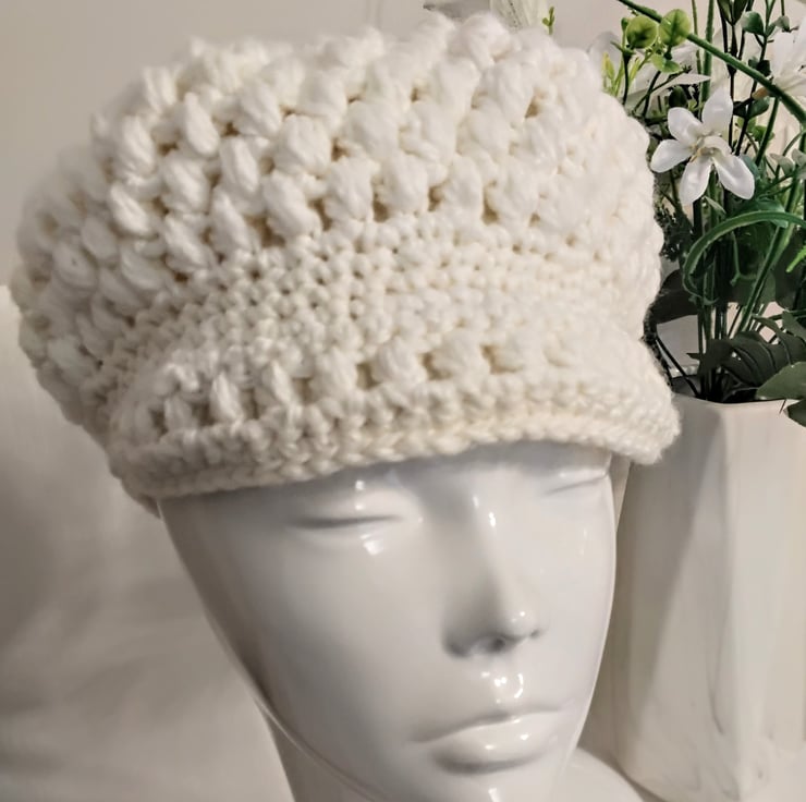 This crochet newsboy.cap is handcrafted with soft, chunky wool/ acrylic mix cream yarn with a small brim at the front. It equally suits a casual or formal outfit.