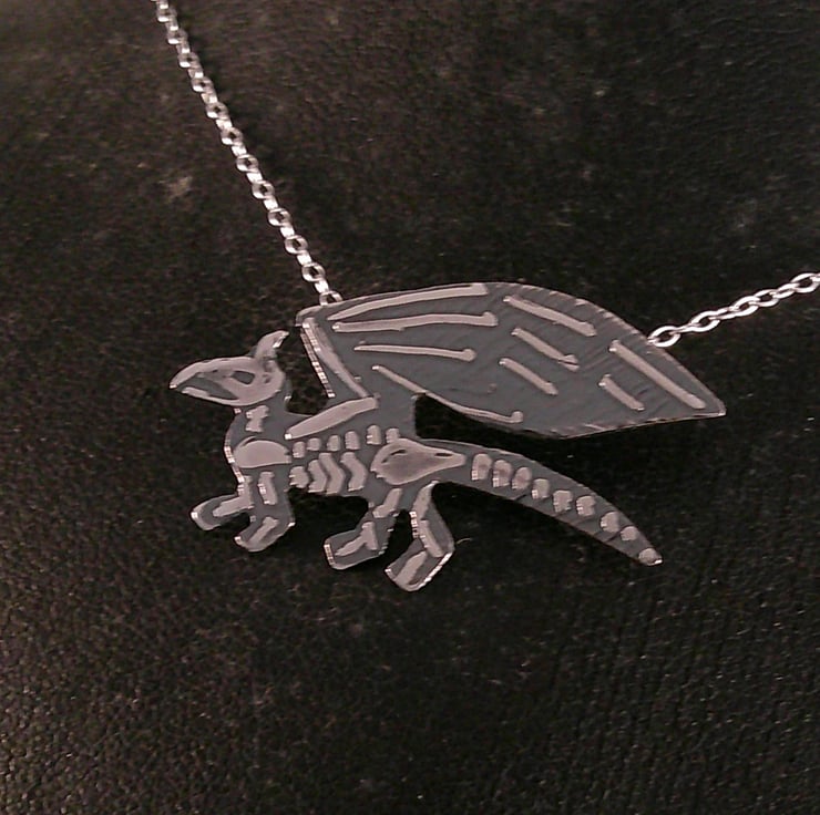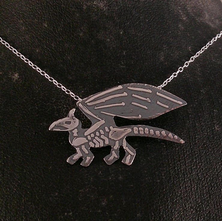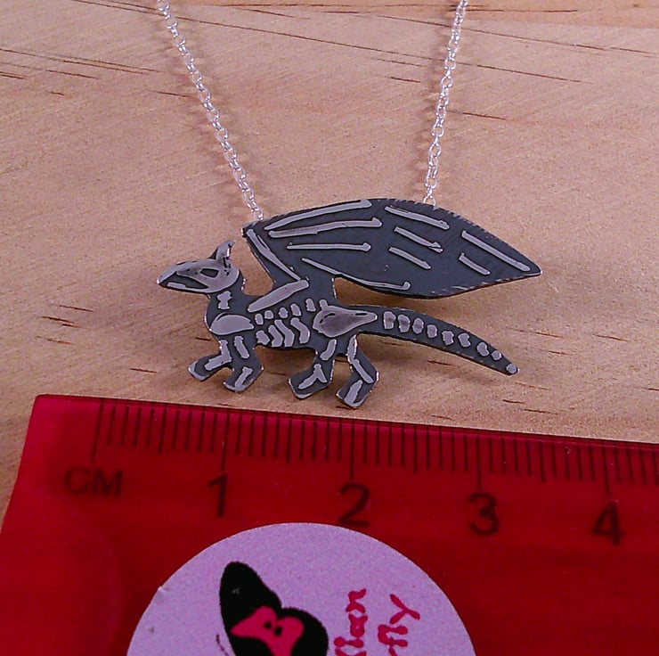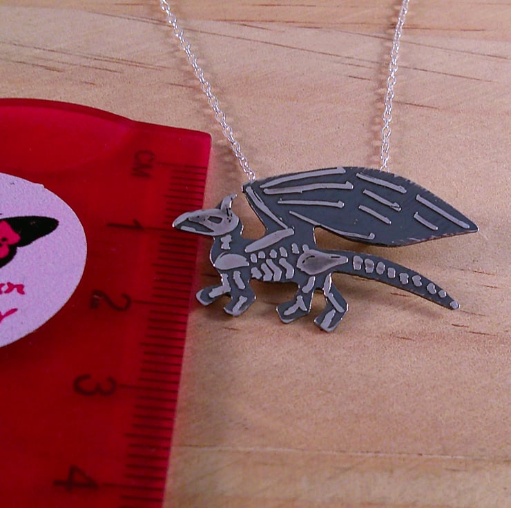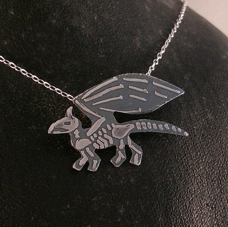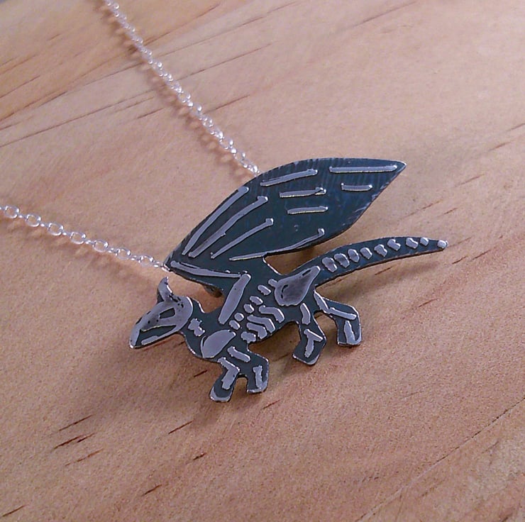 The shape of the winged dragon has been hand pierced from a sheet of sterling silver. The dragon skeleton has then been hand drawn and etched. Two loops have been soldered to the back for the chain and the necklace has been oxidised to blacken the etched details.