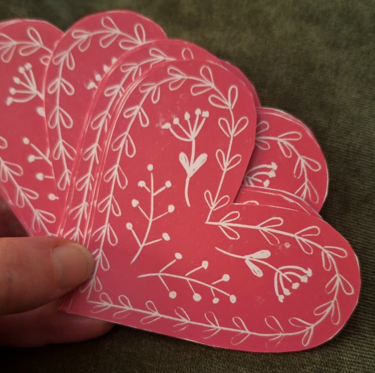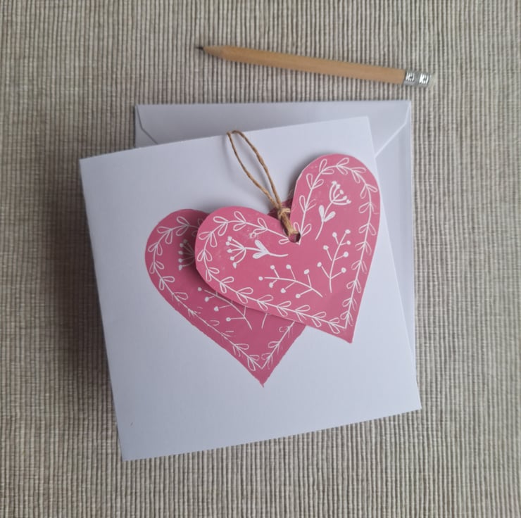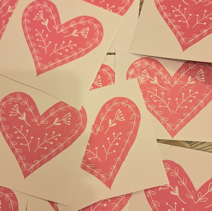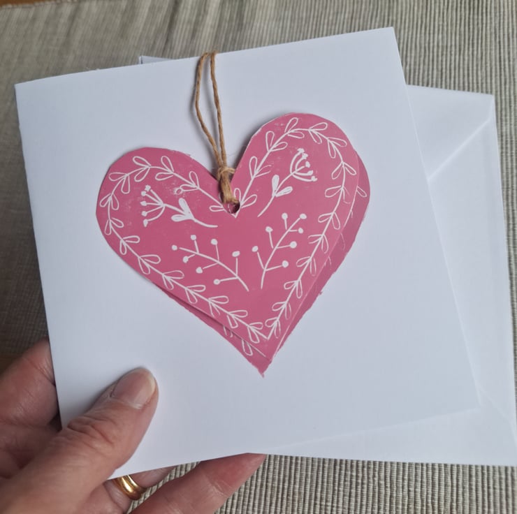 Linoprinted greetings card featuring heart and attached heart decoration.