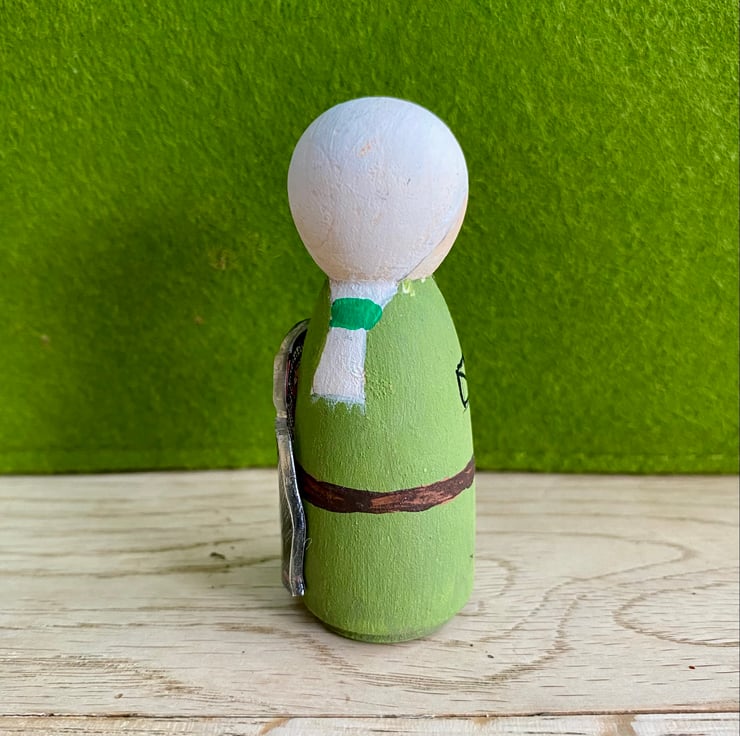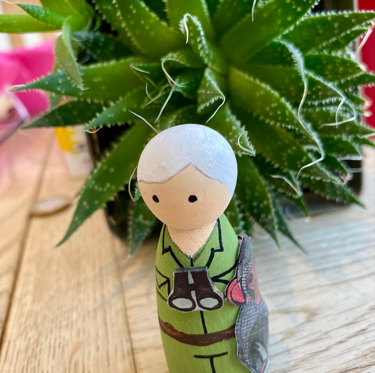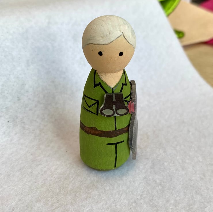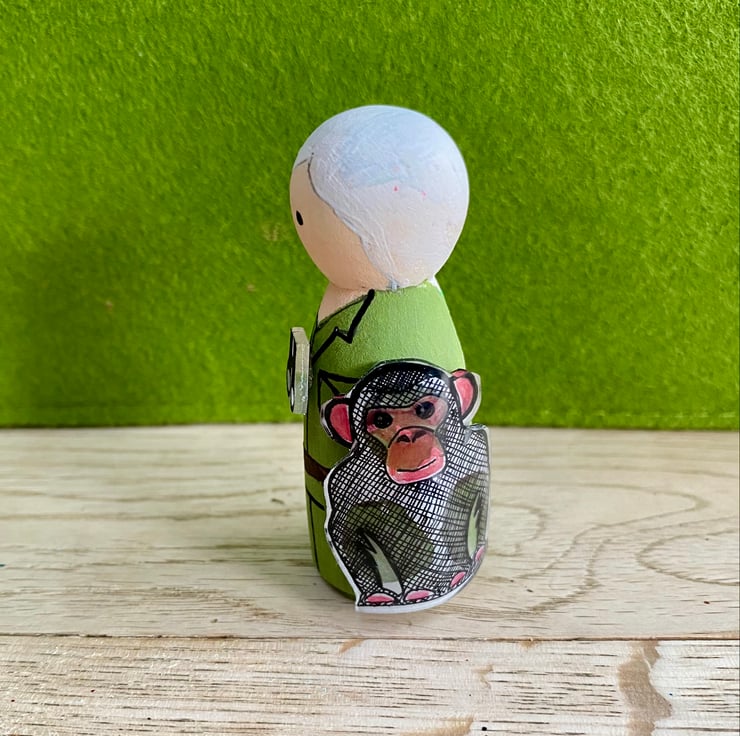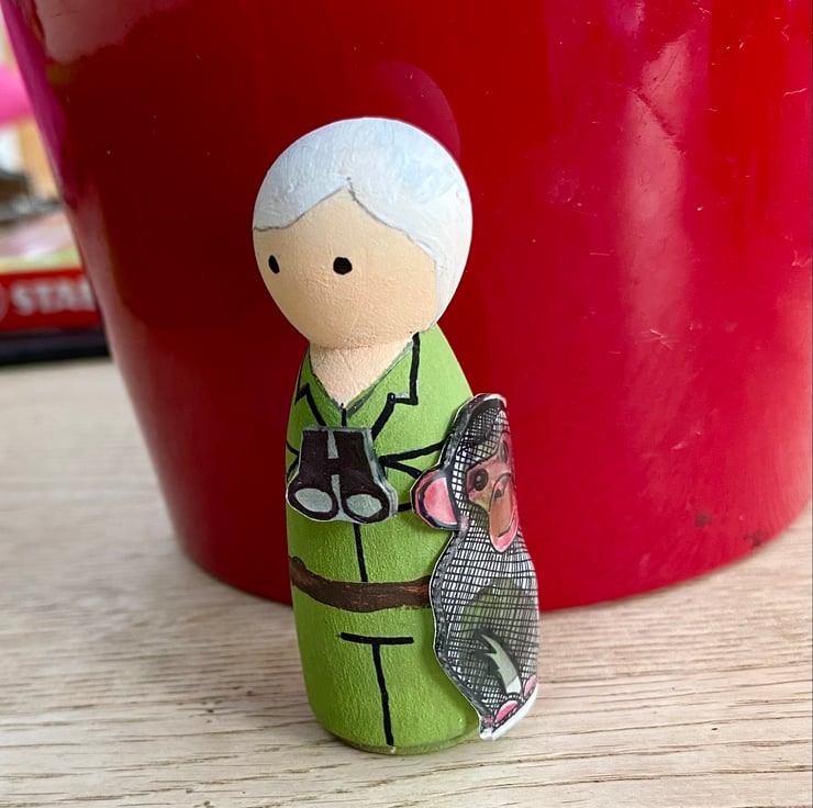 This small wooden peg doll is hand-painted and decorated with shrinkie dink chimpanzee and binoculars. She measures approximately 6.5cm tall and is free standing. Other figures in this 'inspirational women' collection include Emmeline Pankhurst, Marie Curie, Amelia Earhart and Jane Goodall - to name but a few! Pleas check out my shop to view the full range. Custom requests also taken.