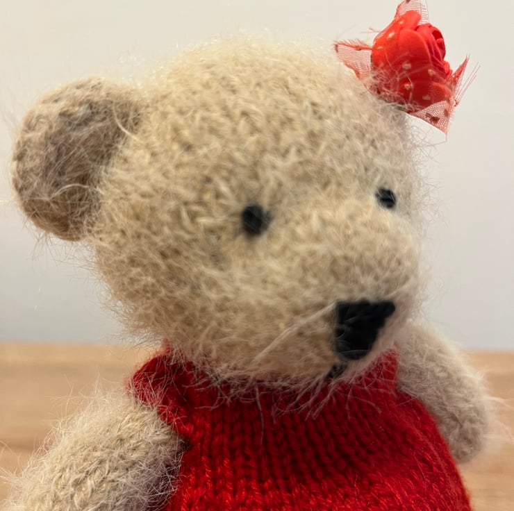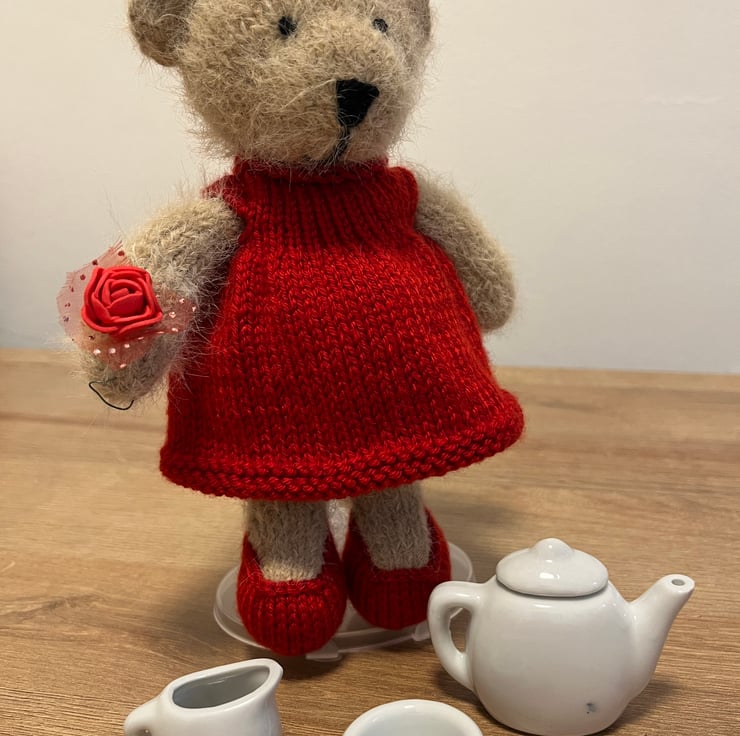 A hand knitted bear named Rose with red dress and matching red shoes. Stands 9inches tall.