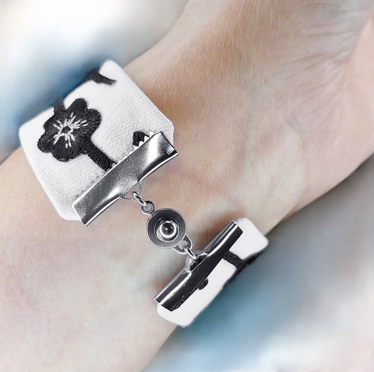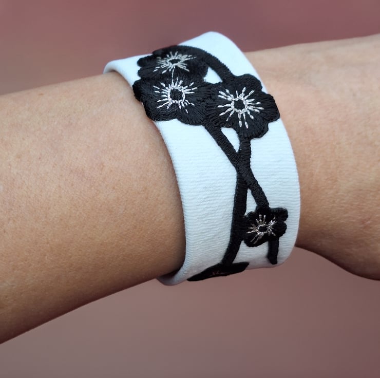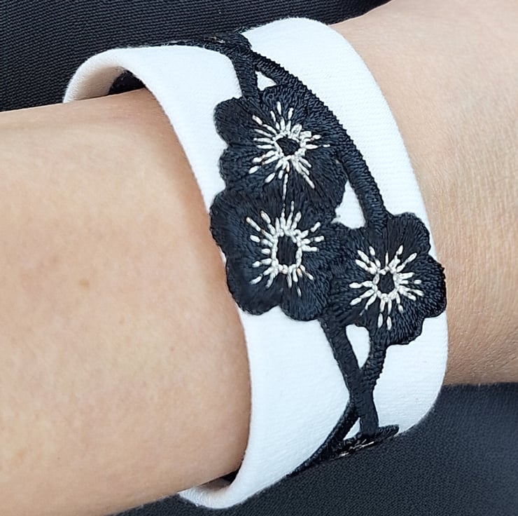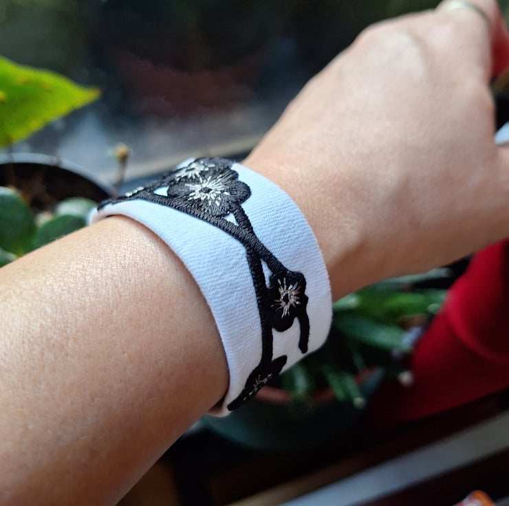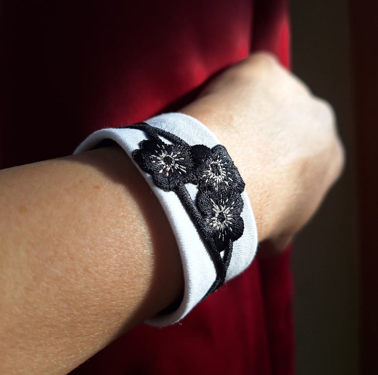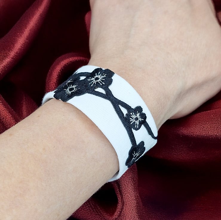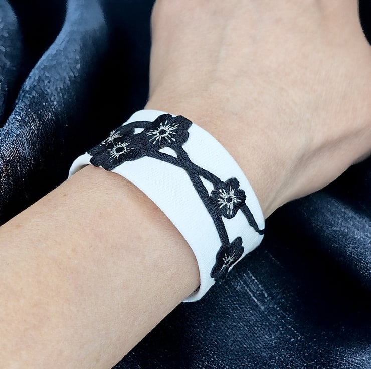 A bold reclaimed denim cuff bracelet handmade from old white jeans skirt, transformed into a striking piece of sustainable textile jewellery. The cuff features a beautiful black and silver colour thread floral applique, added for contrast and texture, giving it a modern boho-goth feel.