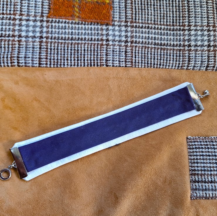 I rescued this denim from a white denim skirt that had lived a full, adventurous life. Instead of letting the fabric go to waste, I reworked it into a cuff that carries a little history, a little character, and a lot of heart. Every stitch is part of that transformation — from worn-in denim to wearable art.
