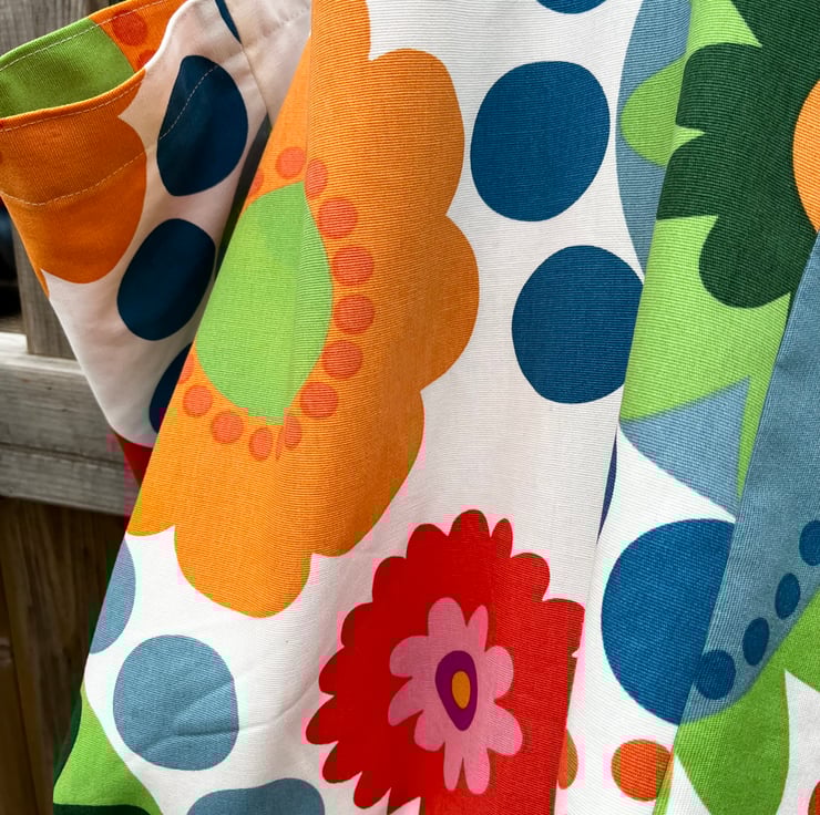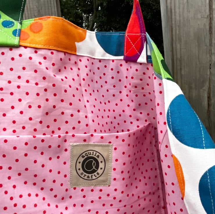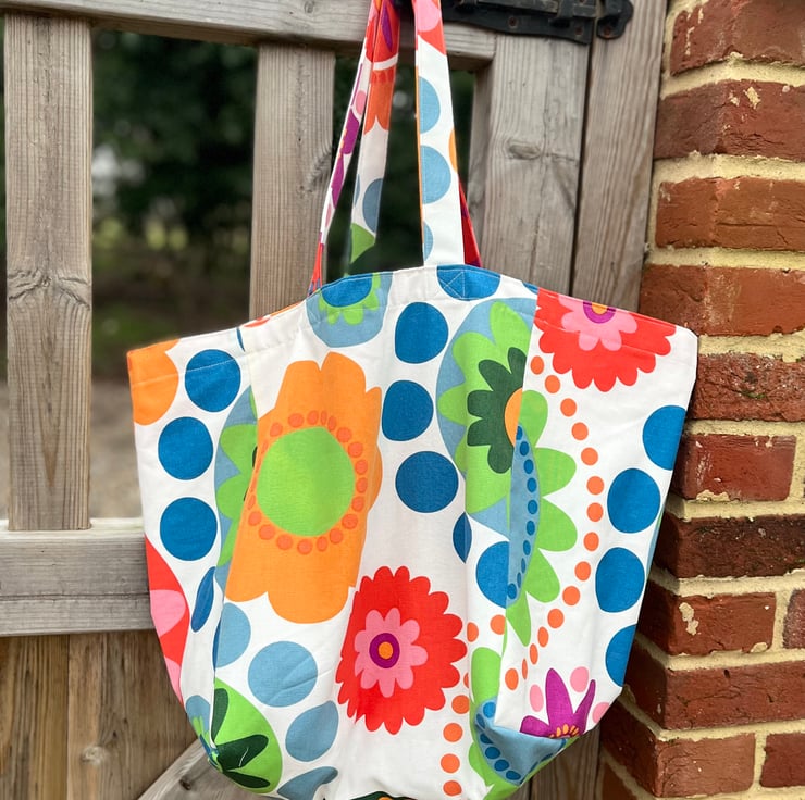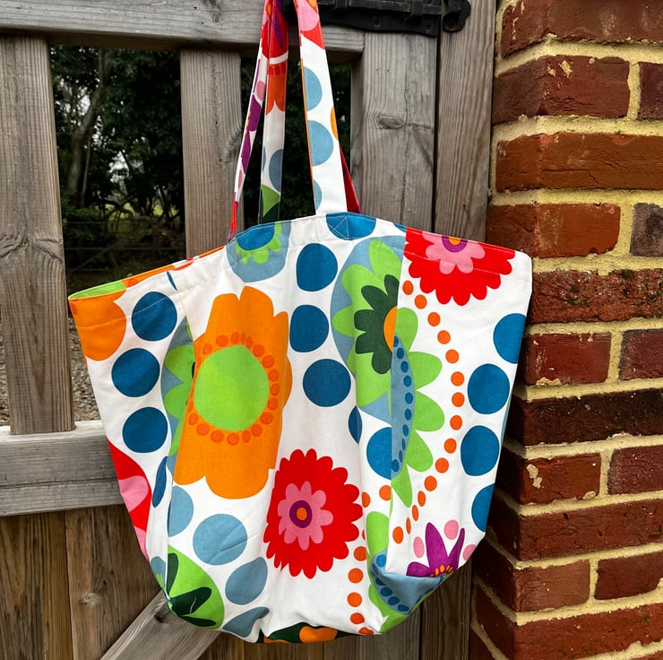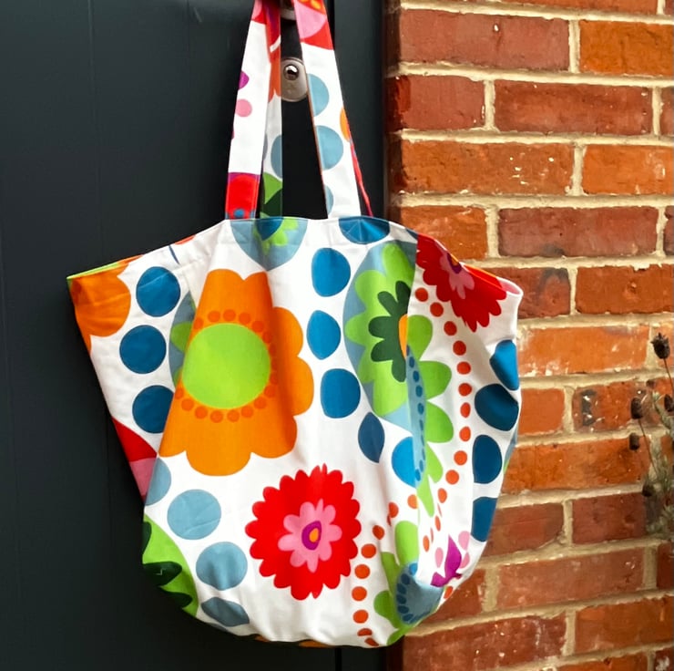 Big, strong tote bag in beautiful, colourful Ikea cotton. This is a discontinued fabric called Fredrika and it has a bold floral pattern on a white background. The bag is fully lined with pink cotton with a red spot. There is a matching patch pocket.
