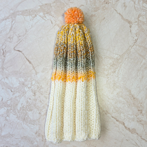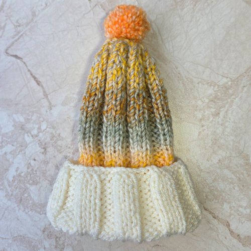 This child size bobble hat has been hand knitted by Brian. He has used chunky 100% acrylic yarn. Cream yarn features as the turn up and variegated yarn has been used to create a unique patterned hat. The hat has been knitted using a rib technique complete with handmade bobble in the the variegated yarn.