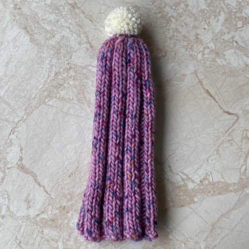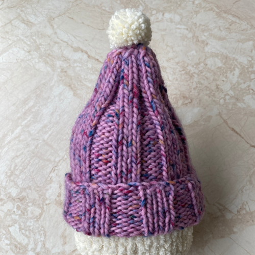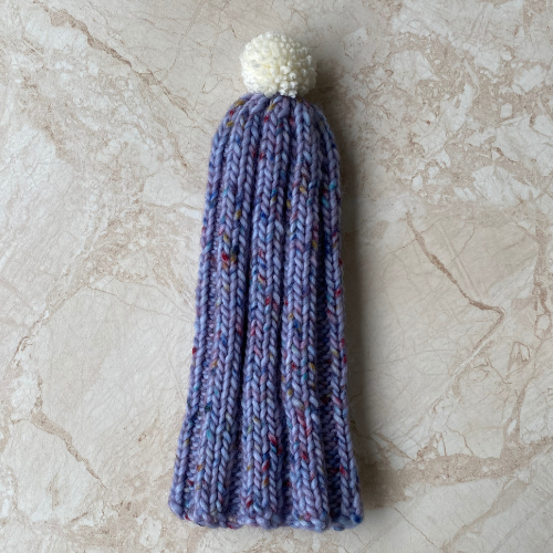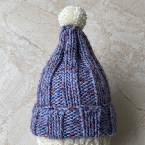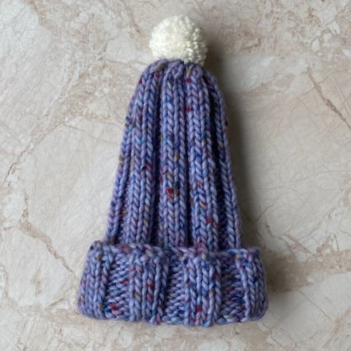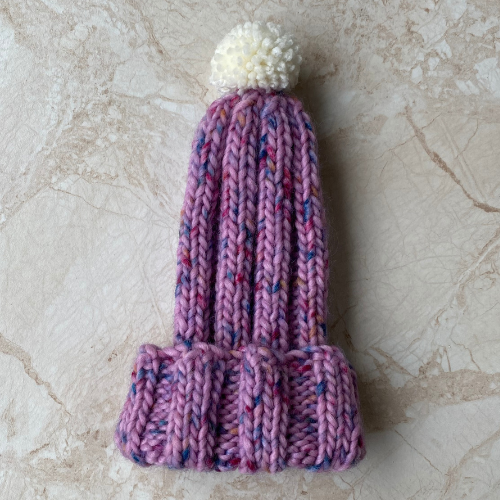 These child sized bobble hats have been hand knitted by Brian. He has used chunky 80% acrylic 20% wool yarn. All three hats have different colour variations blue, pink/purple and green with multicoloured flecking throughout as pictured. The hats have been knitted using a rib technique complete with handmade bobble in the cream yarn.