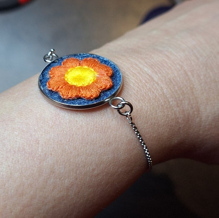 Spring Daisy Bracelet – Orange and Yellow Flower on Denim – Adjustable Chain