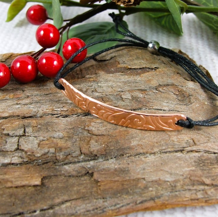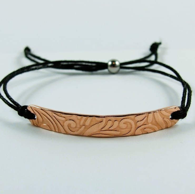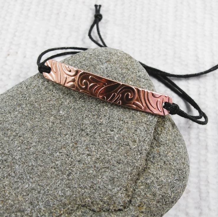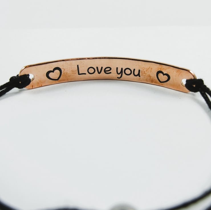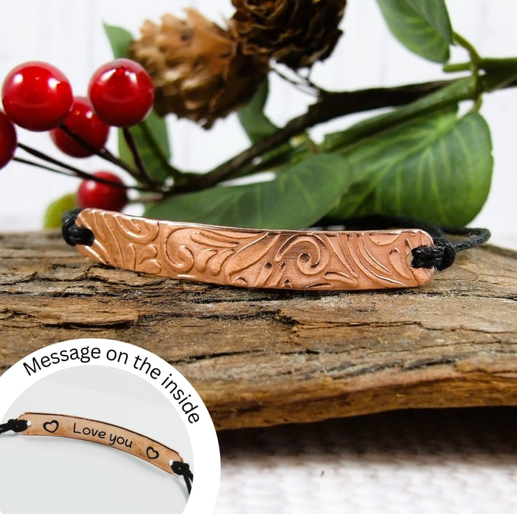 Patterned copper bar bracelet, waxed cotton cord with hidden love you message on the back. Adjustable fit black waxed cord with stainless steel slider closure. Lovely valentine or anniversary gift.