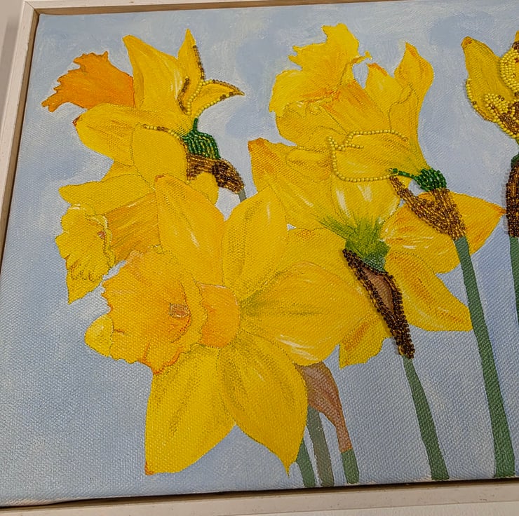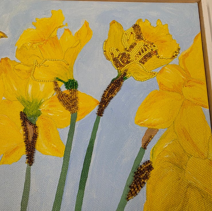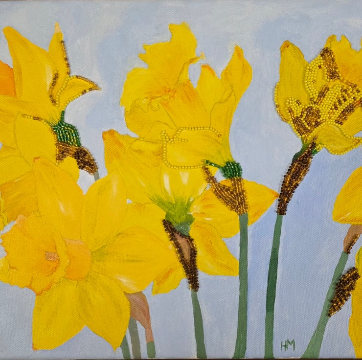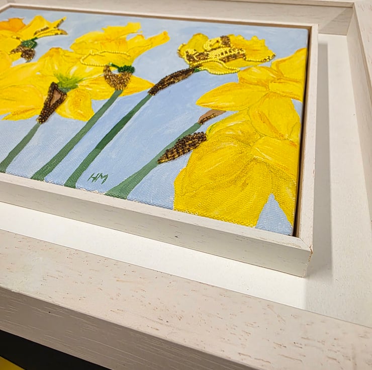 Daffodils is an original mixed media canvas artwork by Hayley Mallett, created as a celebration of the fresh energy and colour of spring. This piece begins with hand painted acrylic on canvas and is then carefully enhanced with hand applied beading, adding subtle texture and depth to the surface. The artwork is signed by the artist in the bottom right corner.