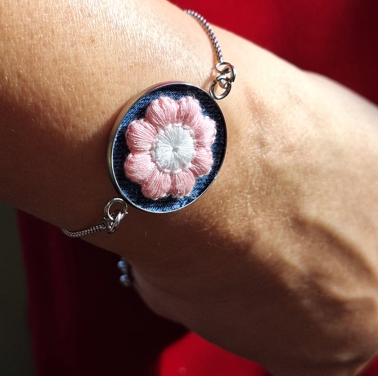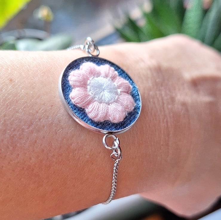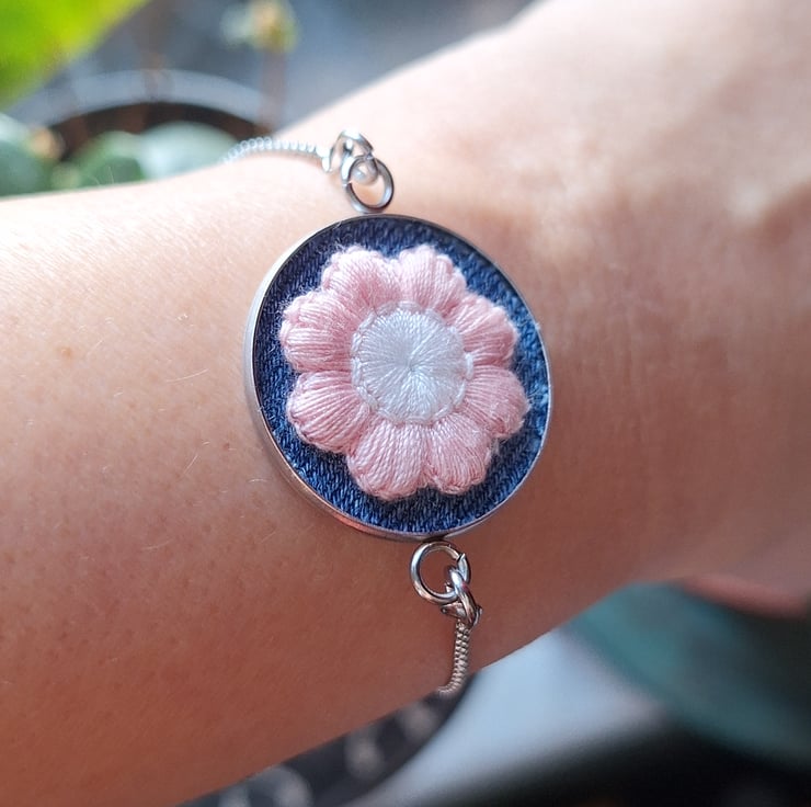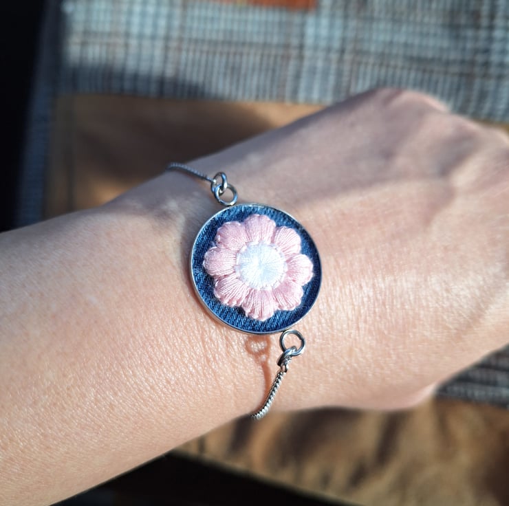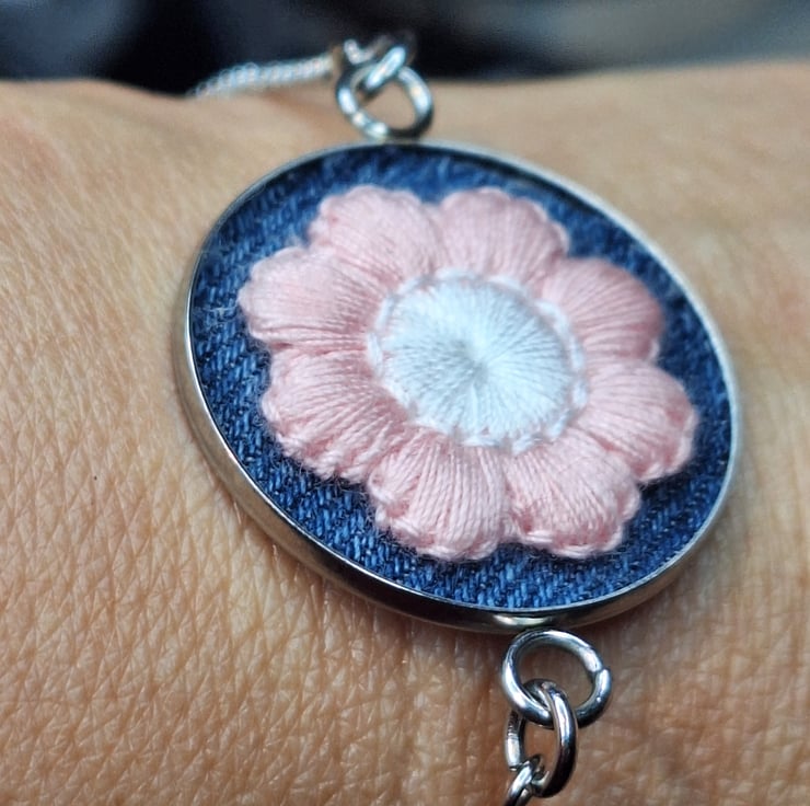 A cheerful floral bracelet featuring a soft light pink and white crochet daisy appliqué, fitted onto reclaimed denim, framed in a 25mm stainless steel bezel and finished with a delicate adjustable slider chain (23cm) with ball ends.