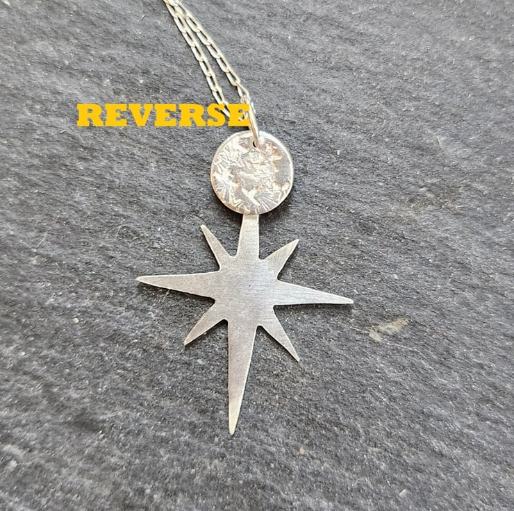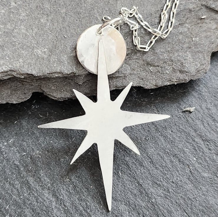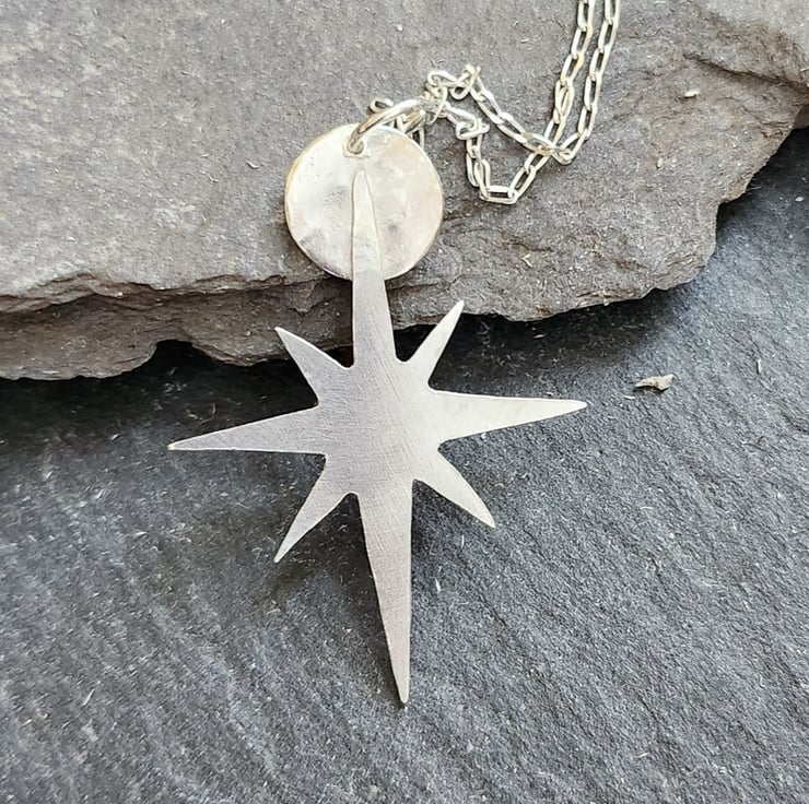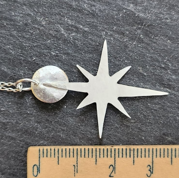 A star pierced from sterling silver sheet. Finished off with a circular moon attached to the top. Just under 4cms long.
