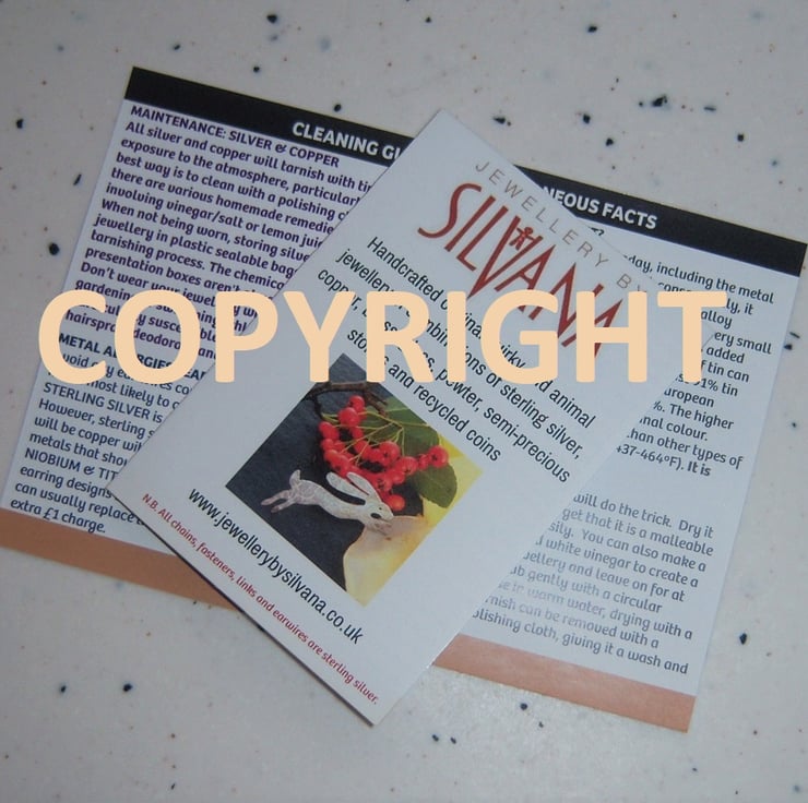 All my jewellery listed here is sterling silver except for the silver plated upcycled cutlery collection. There will be elements of sterling silver in every design (except keyrings and bookmarks), some will be completely so, others may have combinations of copper, brass, bronze, glass, enamel, pewter, resin, upcycled biscuit tins, cutlery and pre-decimal coins and/or gemstones as well. Many of the designs are one-of-a-kind.
