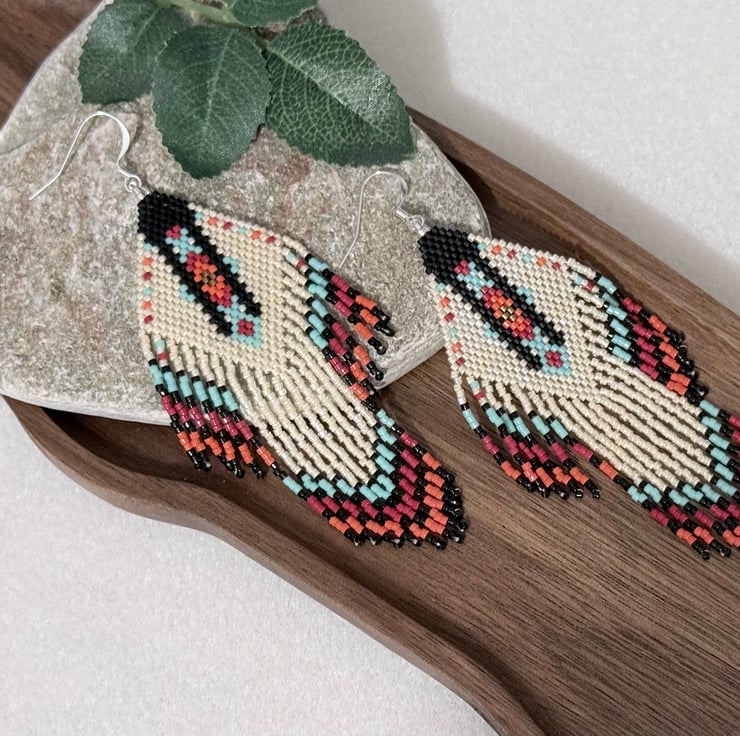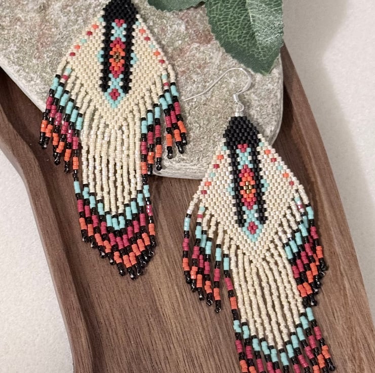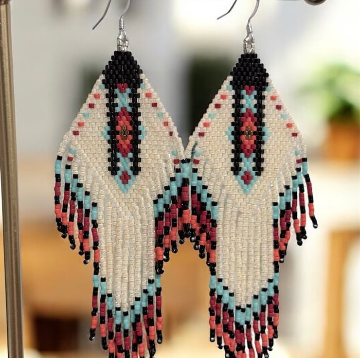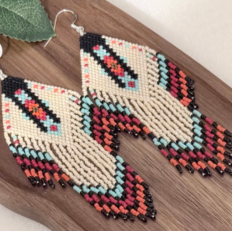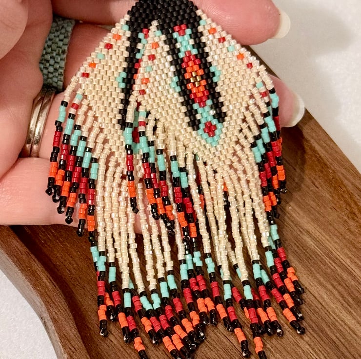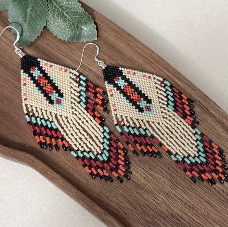Handmade Miyuki® bead fringe earrings created in a bold, geometric pattern inspired by the image of Native American women. Made with a mix of black, beige, turquoise, red, orange and black beads that form a striking chevron design that flows into soft, tapered fringe.