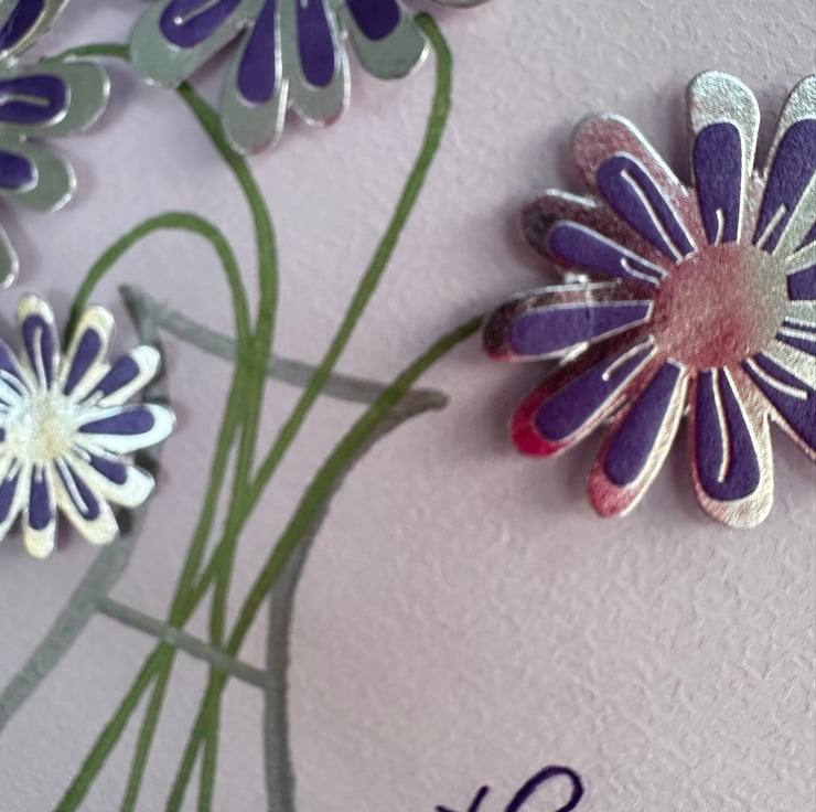 Set on beautifully textured, hammered lilac card, this design features a hand-drawn vase filled with silver and purple blooms. The floral elements sit proud of the card to create lovely depth and tactile detail. Finished with the message “thank you for everything you do”, hand-printed in deep purple archival ink.