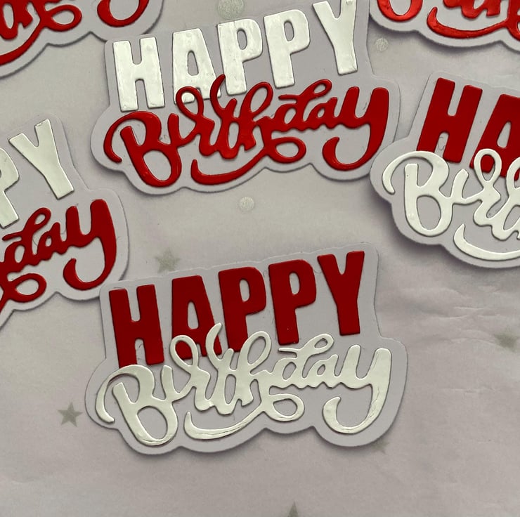 A set of handmade birthday die cut sentiment on a white background using Red and Silver mirror card. Quality 300gsm card used.