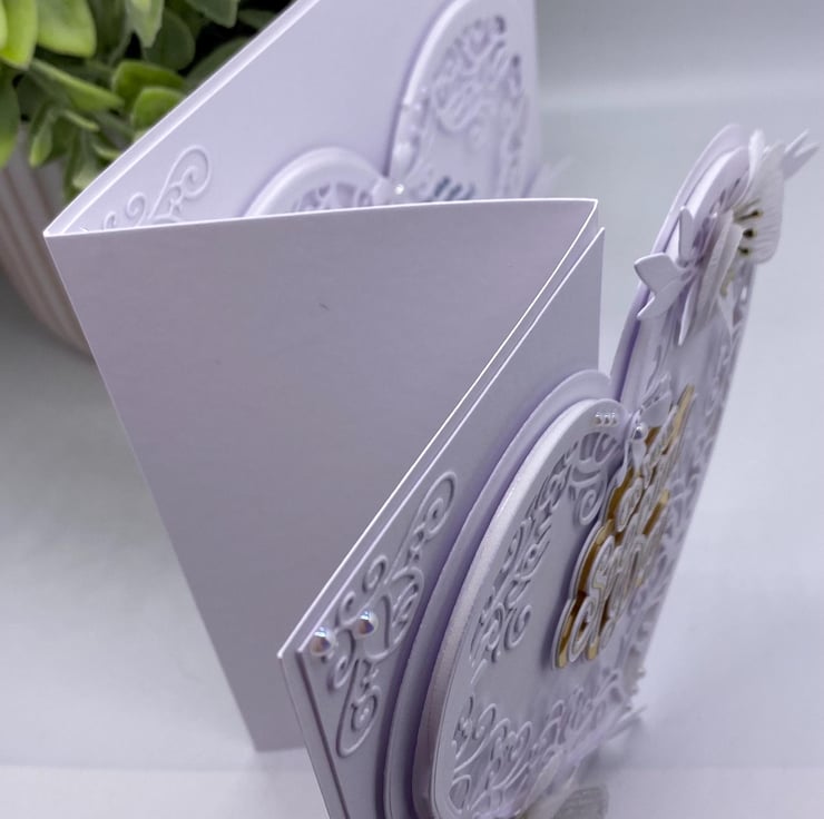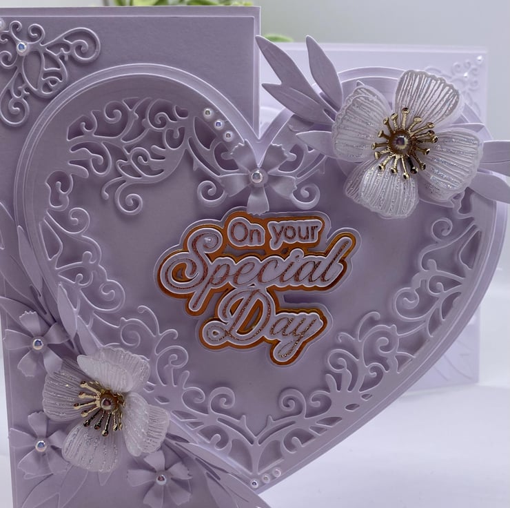 As you can imagine, this type of card with all the die cutting and the 3D flowers takes time and patience, each flower is made out of vellum and has been heat embossed and curled with pearl embellishments.