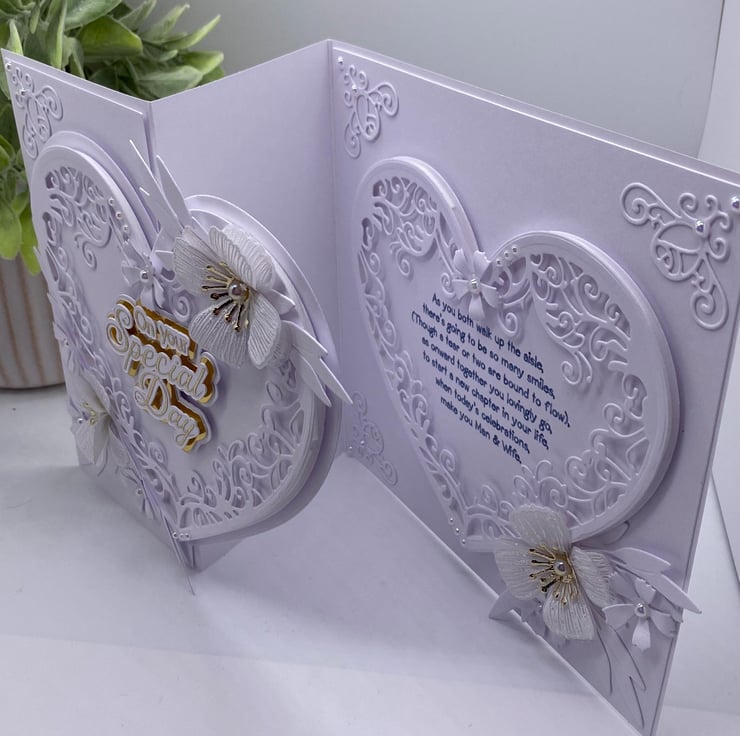 The gold writing has been designed and cut using a cricut machine, with a series of matting and layering and includes a printed sentiment. If you would like to change the message instead of the verse that is already there, then please do get in touch through the conversation messaging, I have already had two orders where this was requested so just get in touch, even if its just to say "Congratulations on your wedding day, Lots of love..."