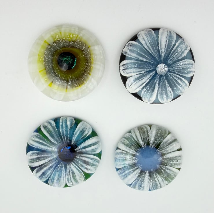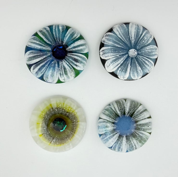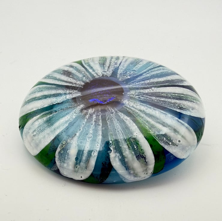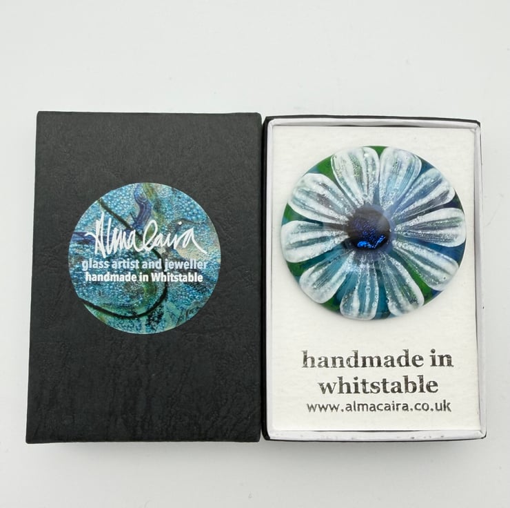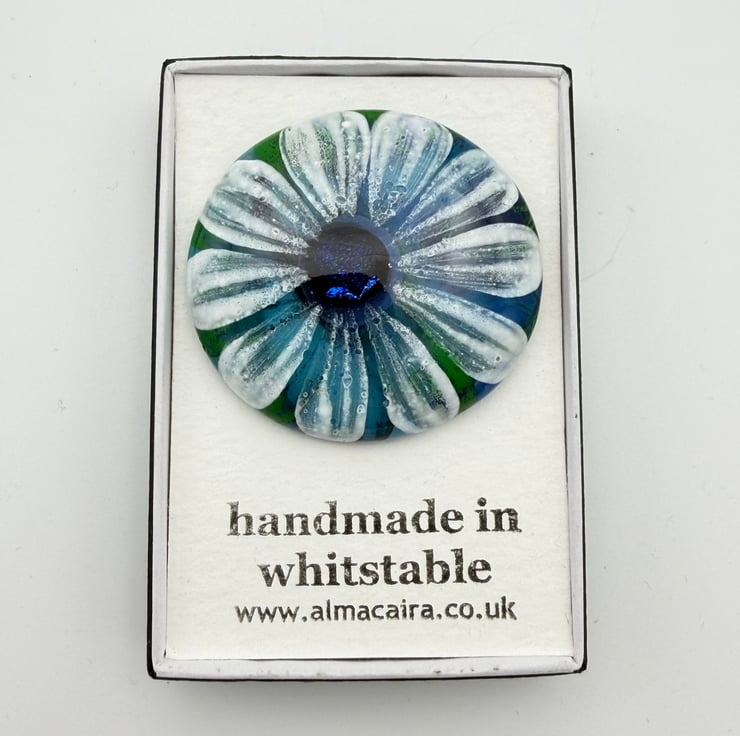 Created from layered Bullseye glass in my Whitstable garden studio. The flower has been hand painted with white enamel over a base of soft blues and greens. Plated sterling silver brooch back glued with epoxy resin to create a permanent bond. Supplied with a black card gift box.
