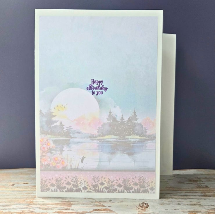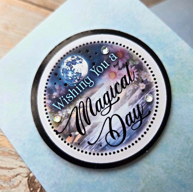 It consists of a luxury cardstock printed with a fantasy landscape of a lake under the light of the full moon, & surrounded by mystical flowers in vibrant colours! A circular topper on the front panel reads the sentiment "Wishing You A Magical Day". On the main panel, a large round topper displays a fairy silhouette, & is surrounded by a matching frame. I have made an extra fairy wing out of vellum, embellished it with glitter accents & placed it on top of the printed wing, for a 3D finish! The card is also embellished with self-adhesive gems on the flower centres for extra sparkle! At the back, a matching insert panel reads the sentiment "Happy Birthday To You".