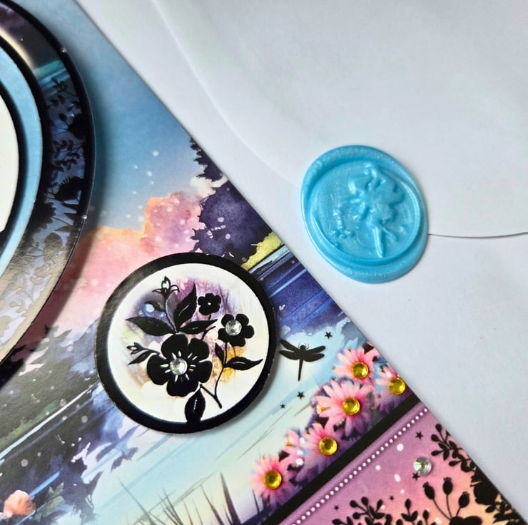 It comes with a white envelope to match the size of the card, & a wax seal stamped with a fairy design, for a unique finish. All kept in a clear cello bag for protection.