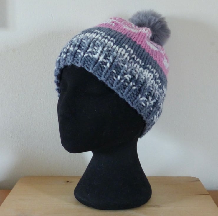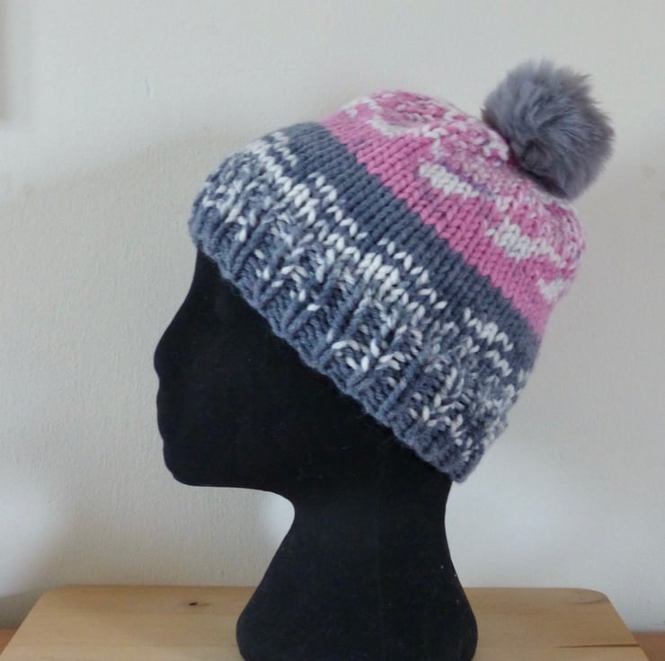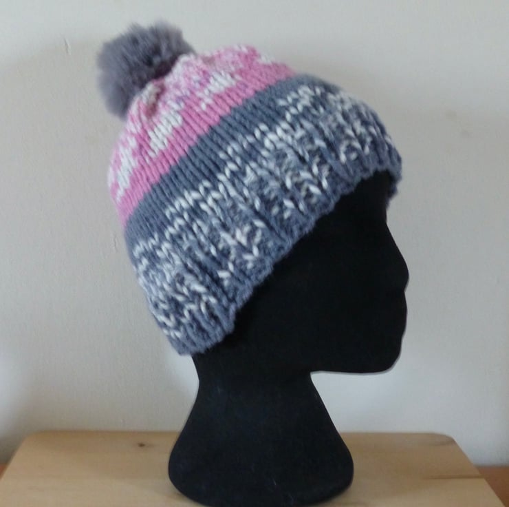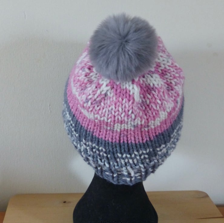 A hand knitted Beanie Hat in a chunky self patterning yarn which gives a 'fairisle' effect. It is 80% Acrylic and 20% Merino Wool so is lovely and soft. The colours are Pink, Grey and Off White and it is topped with a fluffy Grey pompom.