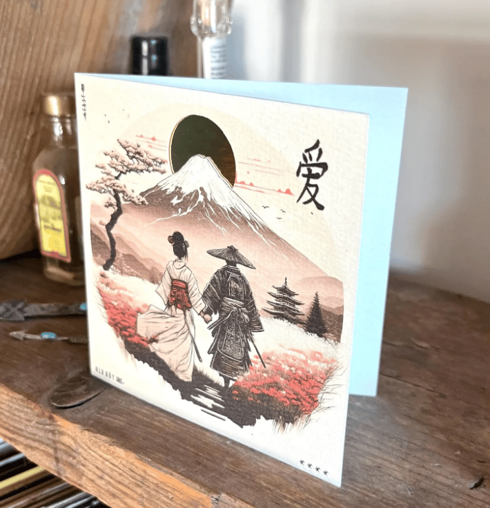This is a handmade Japanese design on thick quality watercolour card with cut out and underlaid gold card.