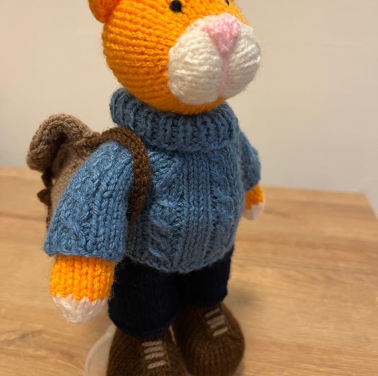 Gorgeous hand knitted orange cat named Milo with blue woolly jumper and trousers. Complete with hiking boots and rucksack.