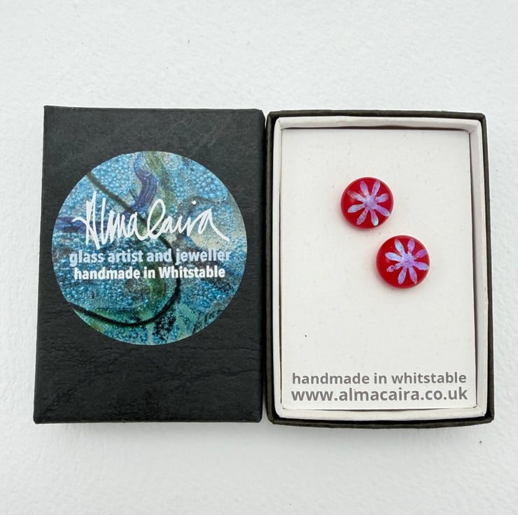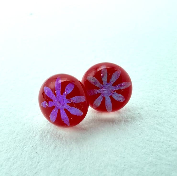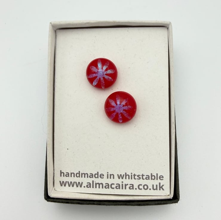 Beautiful red fused glass stud earrings with multicoloured dichroic flower detail.