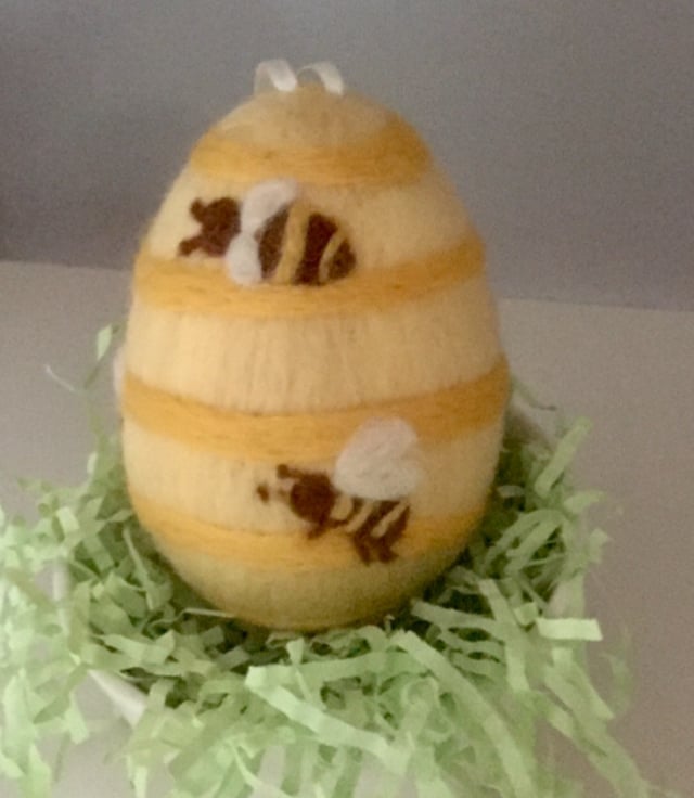 Hand made Easter Egg. It is needle felted on the Styrofoam core egg. It is a bee motif eggs on the lemon yellow colour with darker yellow stripes. The bees are needle felted from brown wool.