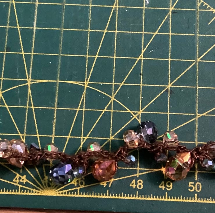 I’ve used mix colours , glass beads all crochet with woven cream cord.