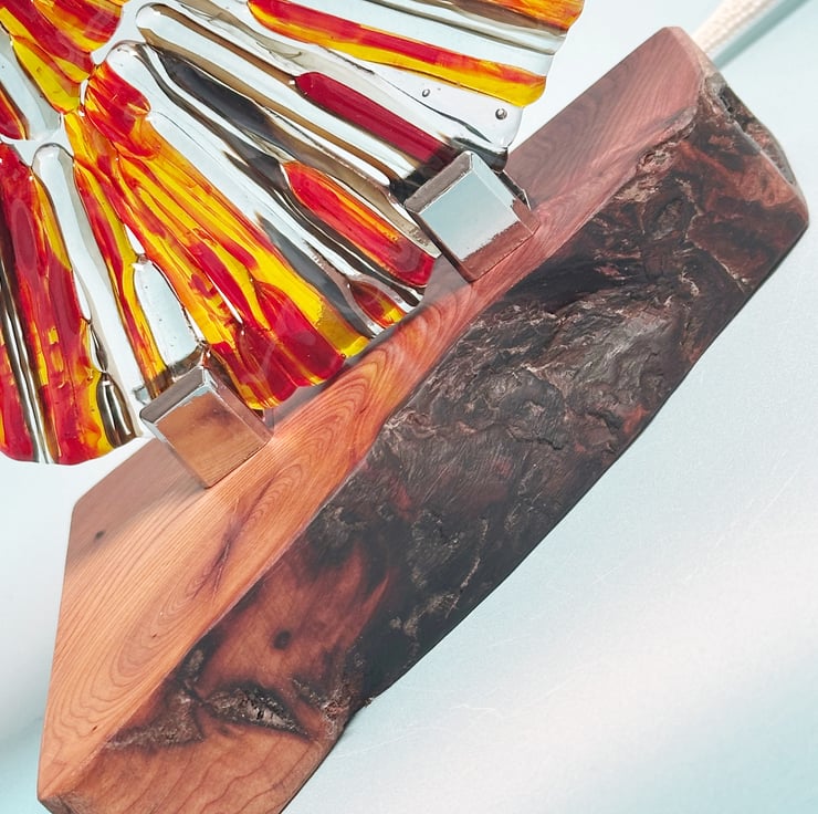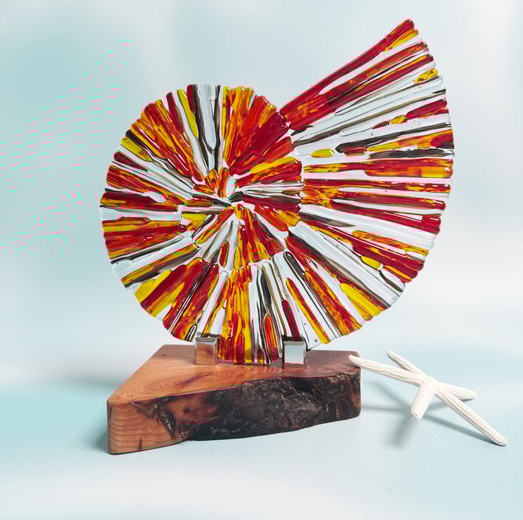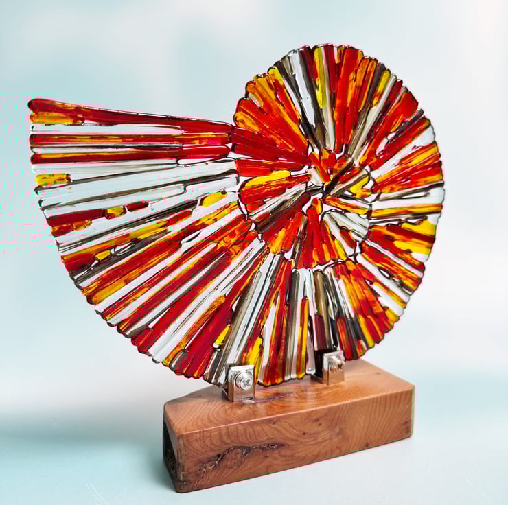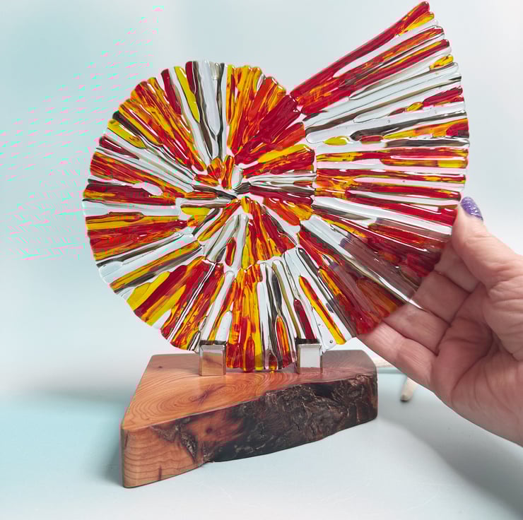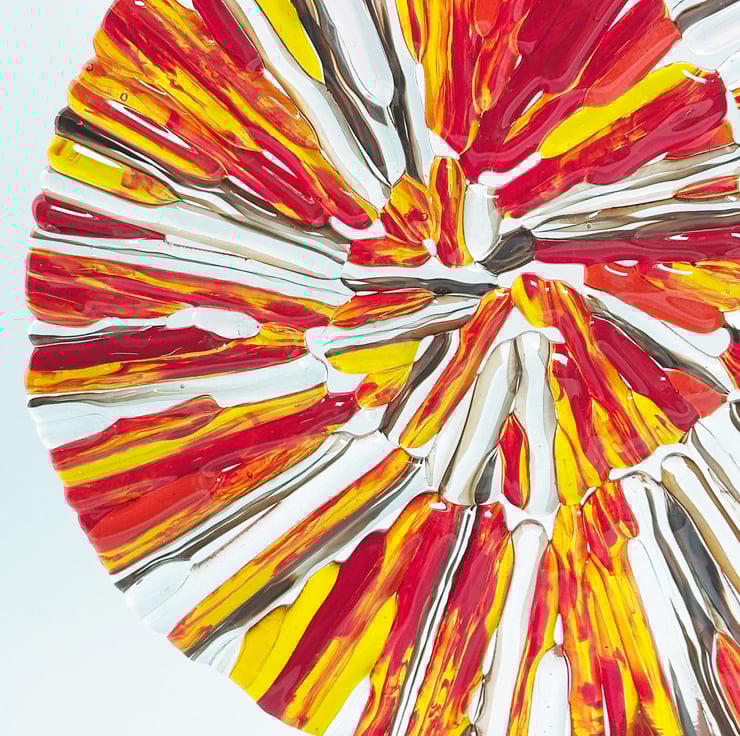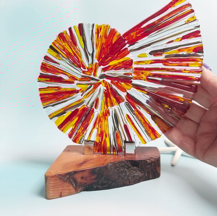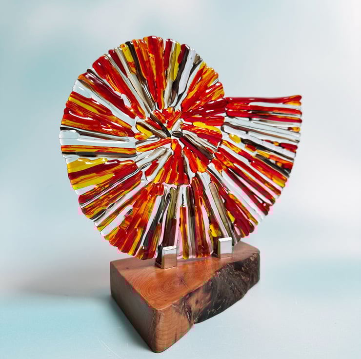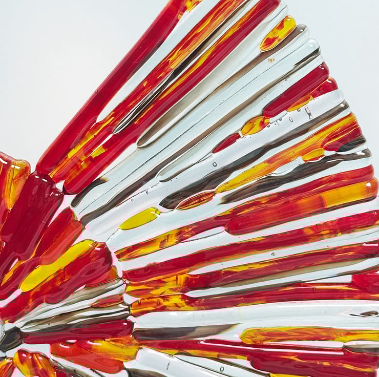 Hand cut strips of glass in shades of red, amber brown and clear, placed on their sides in a spiral pattern and fired in the kiln to a temperature which retains the organic texture.