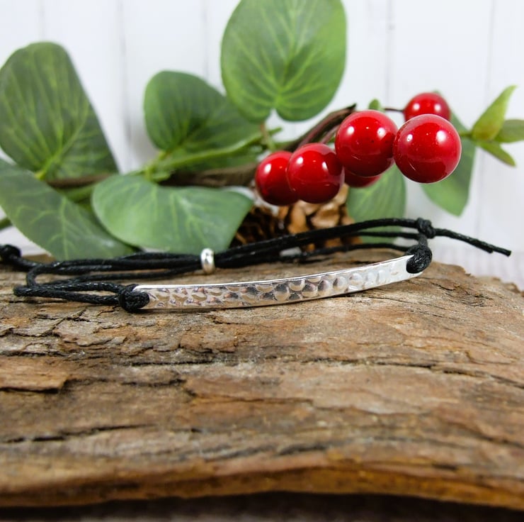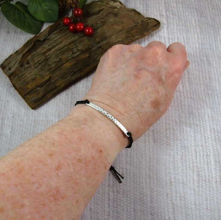 The bracelet centre piece is a silver bar created from 3mm silver wire that I have flattened and textured on the front with a dotty effect. On the inside I have laser engraved with some small hearts and 'Love you always'. I have paired this with black waxed cotton cord fitted with a sterling silver slider clasp so it's fully adjustable.