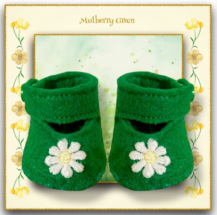 A cute little pair of green shoes, decorated with little daisies, to fit the Mulberry Green characters. The shoes look lovely with the little dresses.