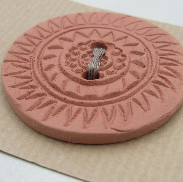 Large terracotta button, textured with a wooden block print pattern of a mandala sun