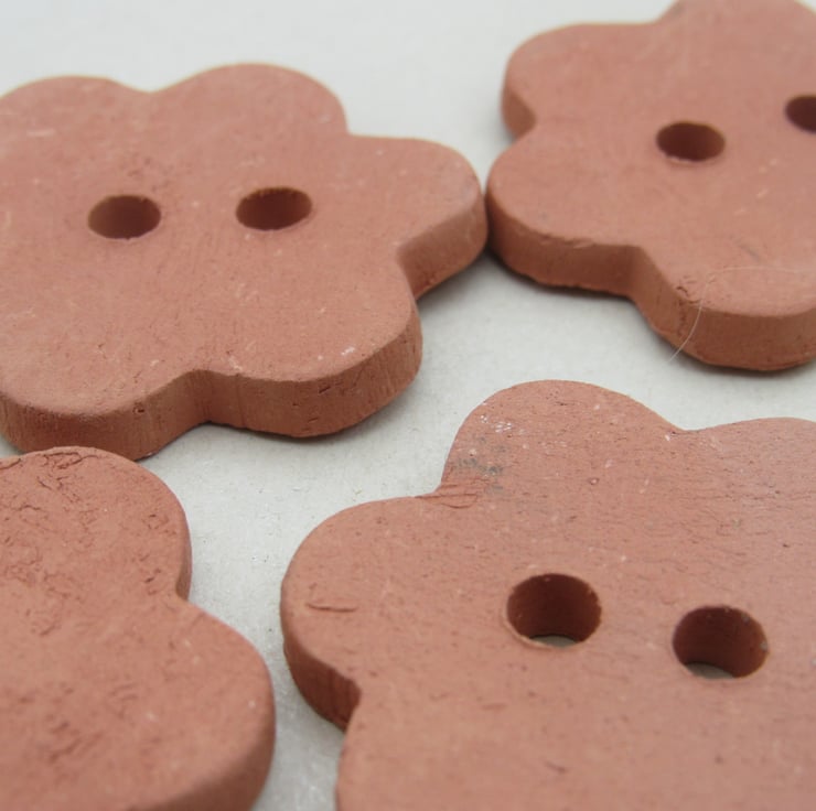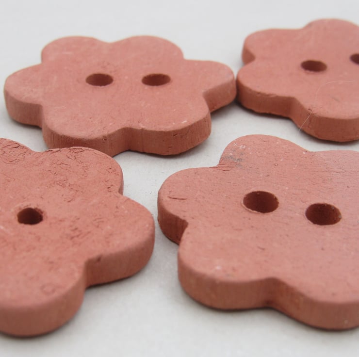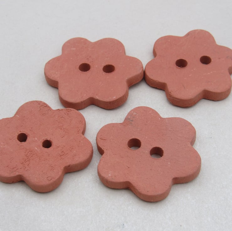 4 medium flower shaped terracotta clay buttons, unglazed and polished smooth .