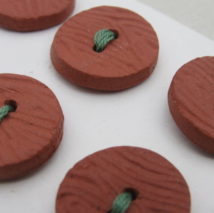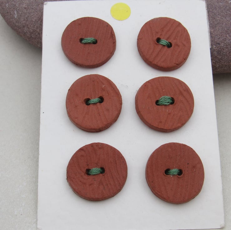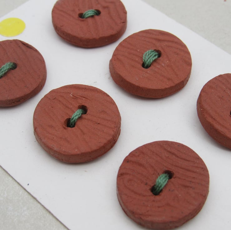 6 small terracotta buttons lightly patterned with a delicate woodgrain texture.