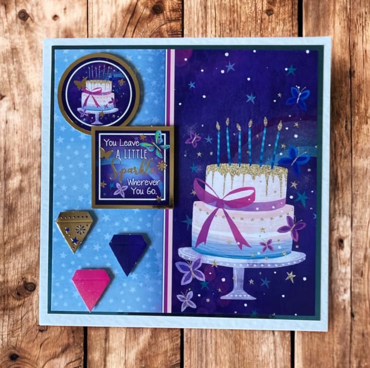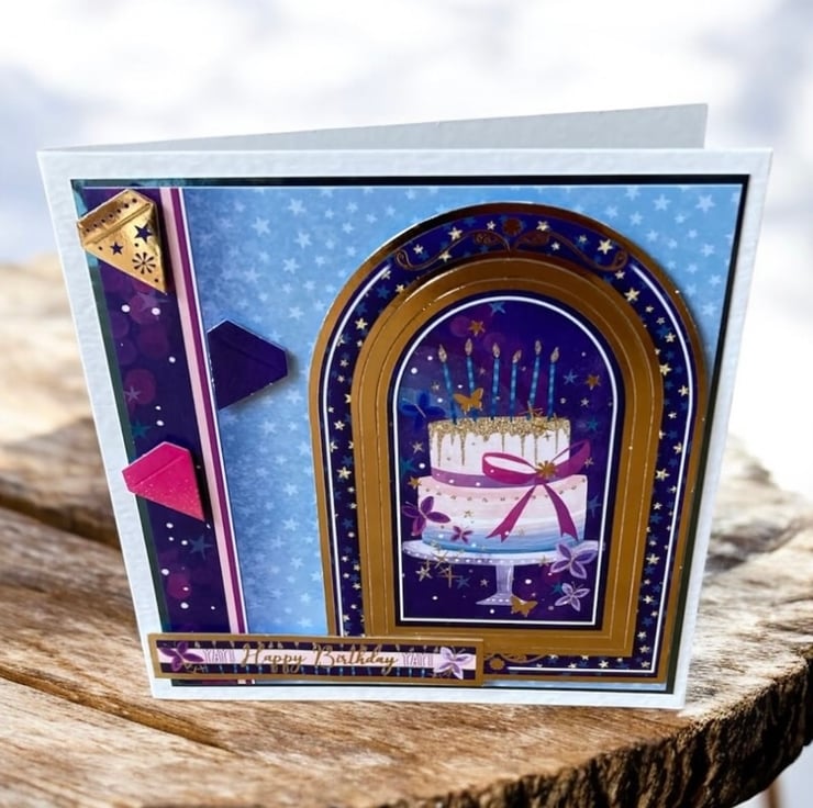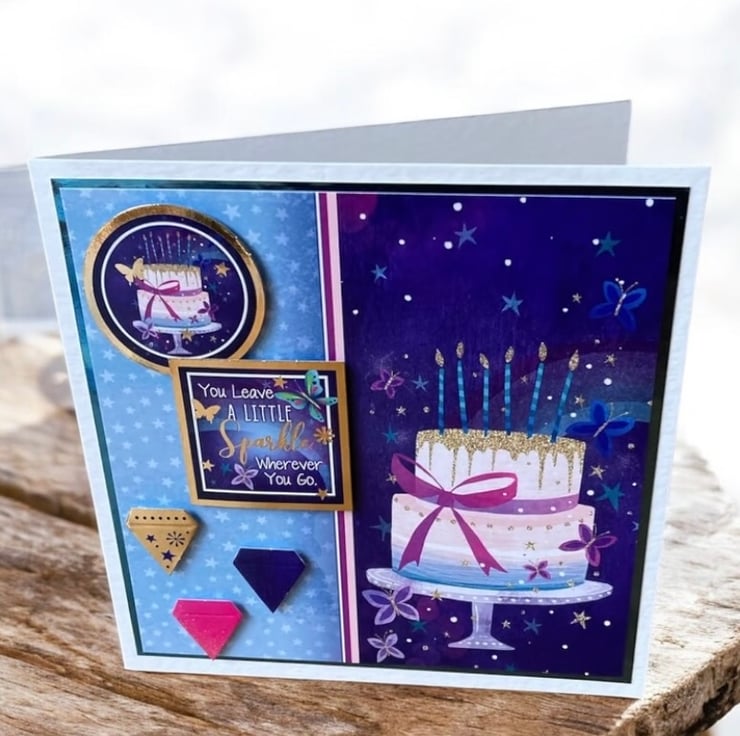 Celebrate someone special with this lovely set of two handmade birthday cards, beautifully designed in tones of blue, purple, and pink. Each card features layered 3D elements with delightful birthday cakes and candles, adding texture, dimension, and a touch of magic. The crisp white card base has been layered with blue mirror card and coordinating patterned paper, giving the set an elegant finish.