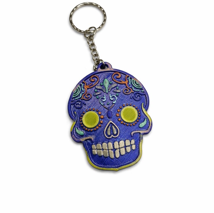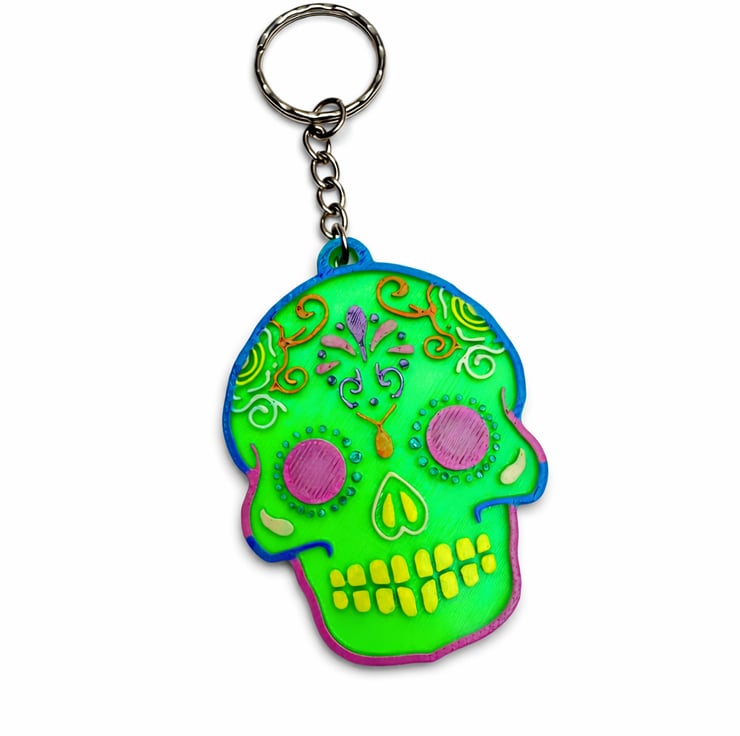This sugar skull keychain features a highly detailed design inspired by traditional decorative skull motifs, carefully produced to create a clean, crisp finish that stands out while remaining practical for everyday use.