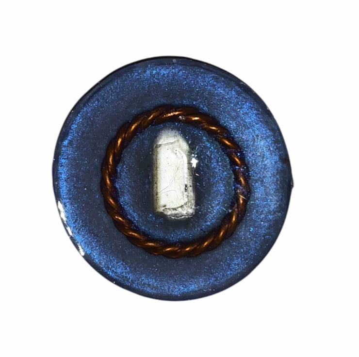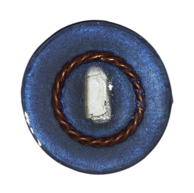 The Tensor Ring Pocket Puk operates at a frequency of 144 MHz and features a prominent deep blue quartz crystal. This unique combination enhances its aesthetic appeal while serving its intended purpose effectively.