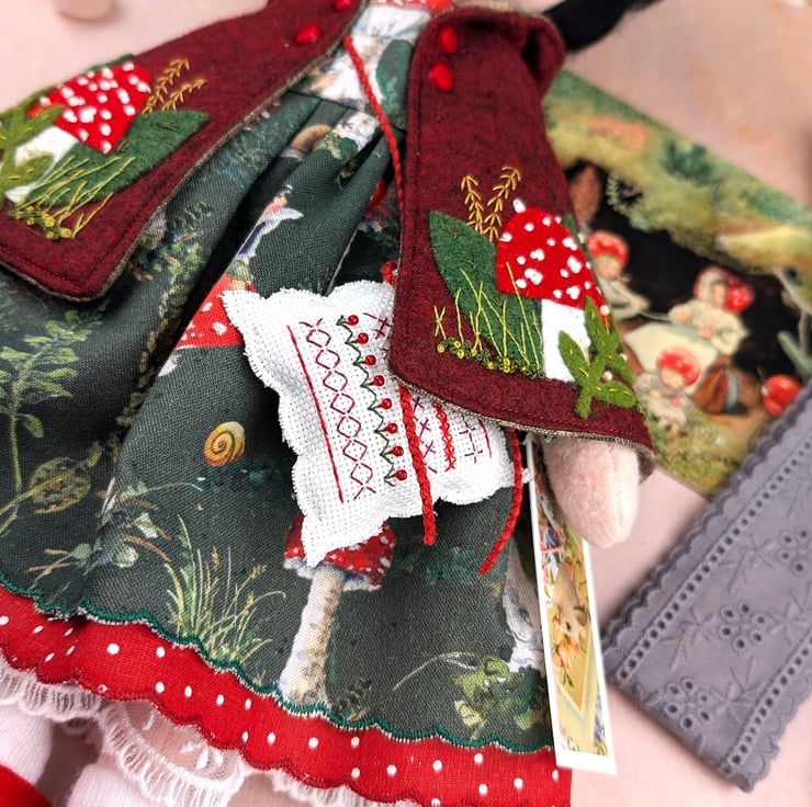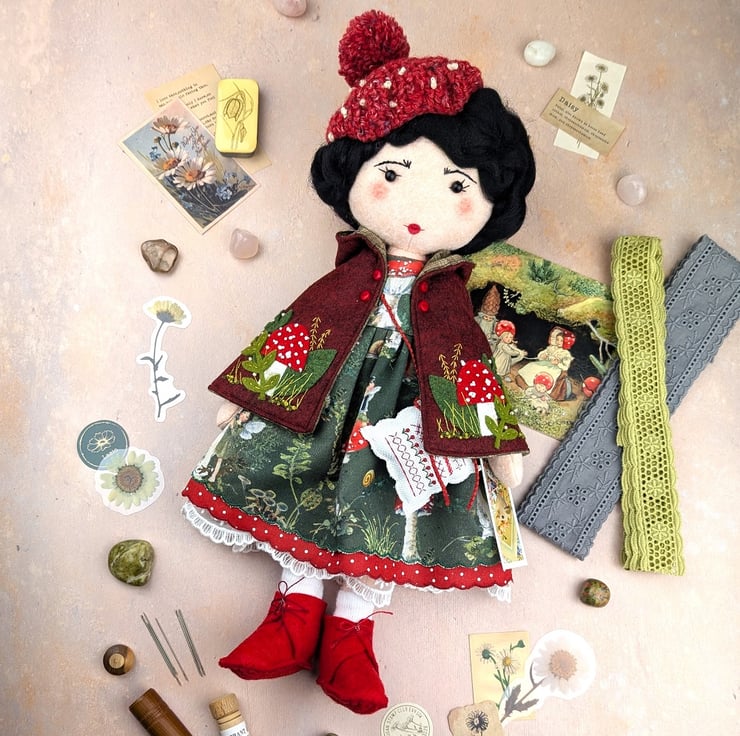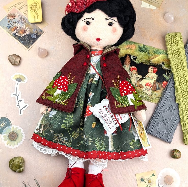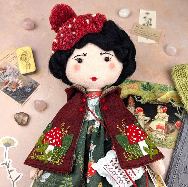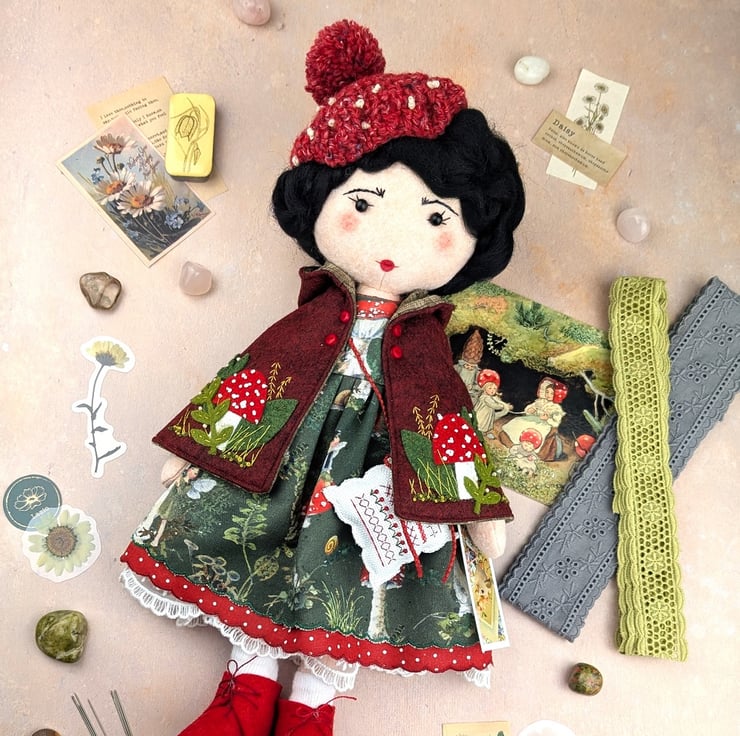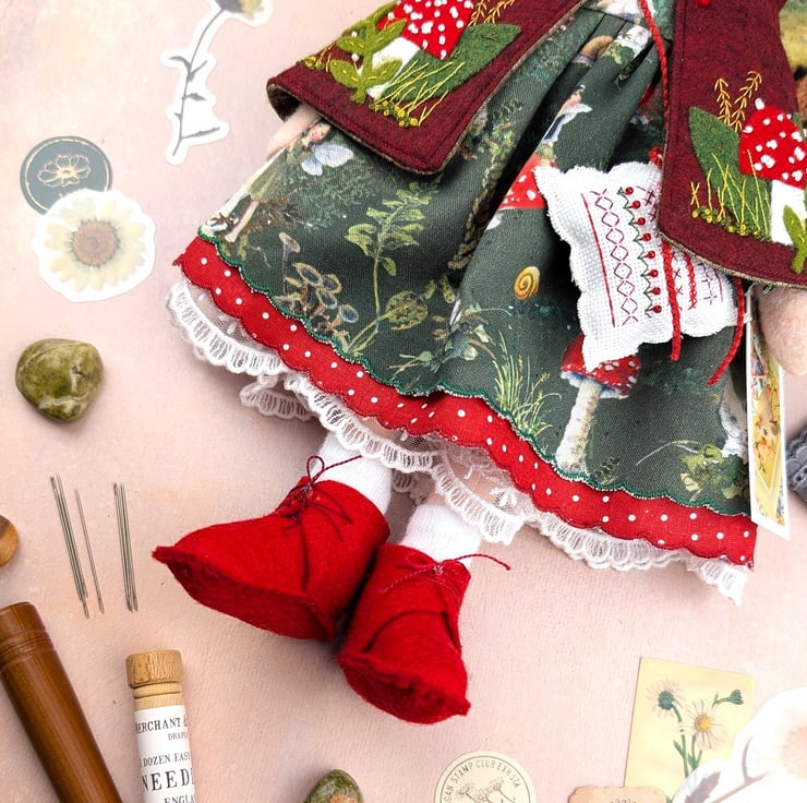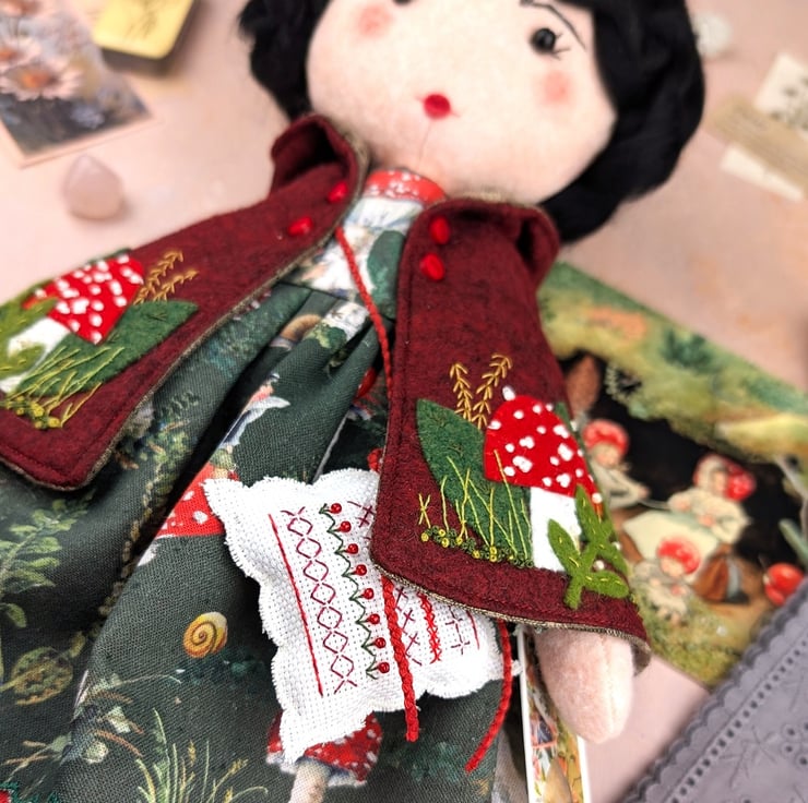 This is Mia,The Elf Seeker, a doll made from wool felt with glass bead eyes and black wool roving for hair. Her facial details are hand embroidered and her hair is hand styled. She is dressed in an Acufactum print cotton called Elves and Toadstools and sports a wool felt warm dark crimson cloak lined with a red and green Japanese yarn dyed fabric. Her bobble hat is Tweed Felt Rowan Wool with toadstool french knots.
