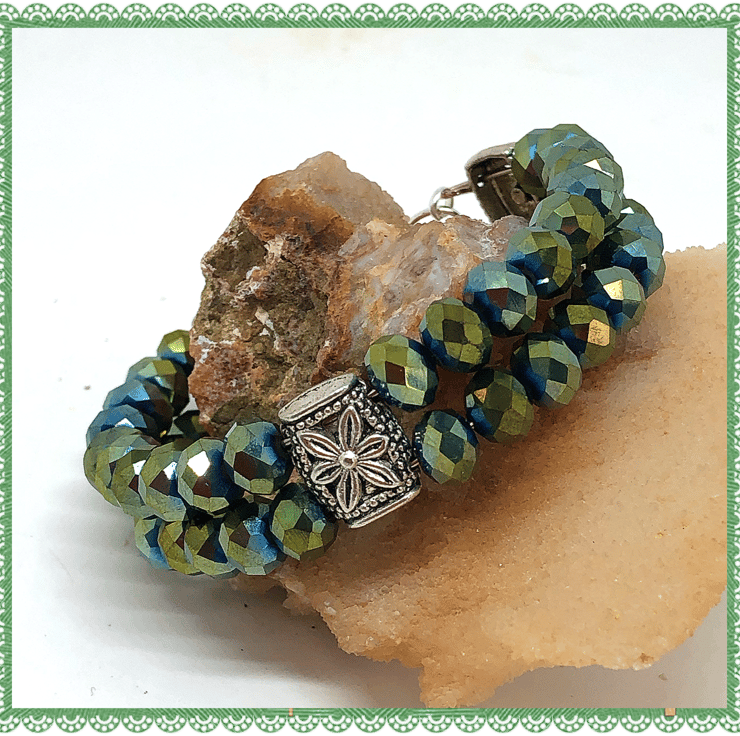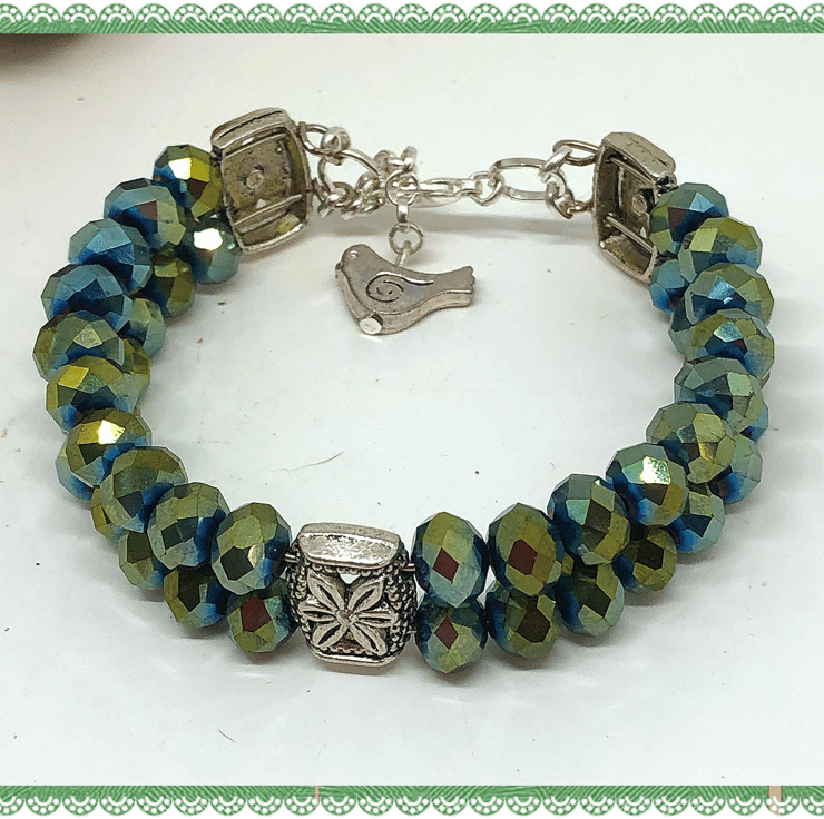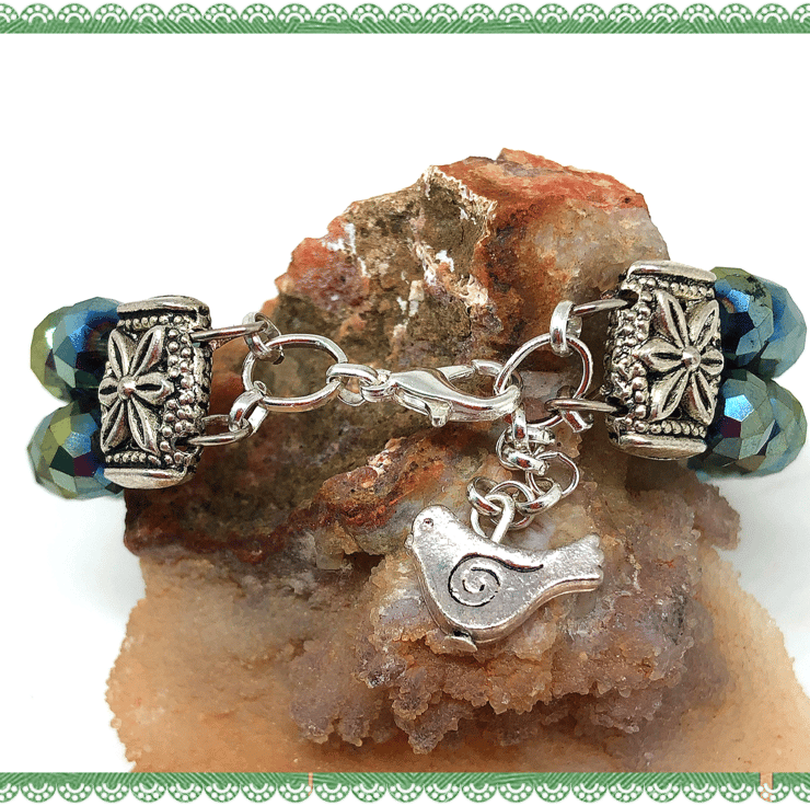 Created using metallic green faceted rondels threaded onto memory wire, Tibetan silver double connectors, trigger clasp with extension chain finished with a a bird charm. Nickel free adjustable.