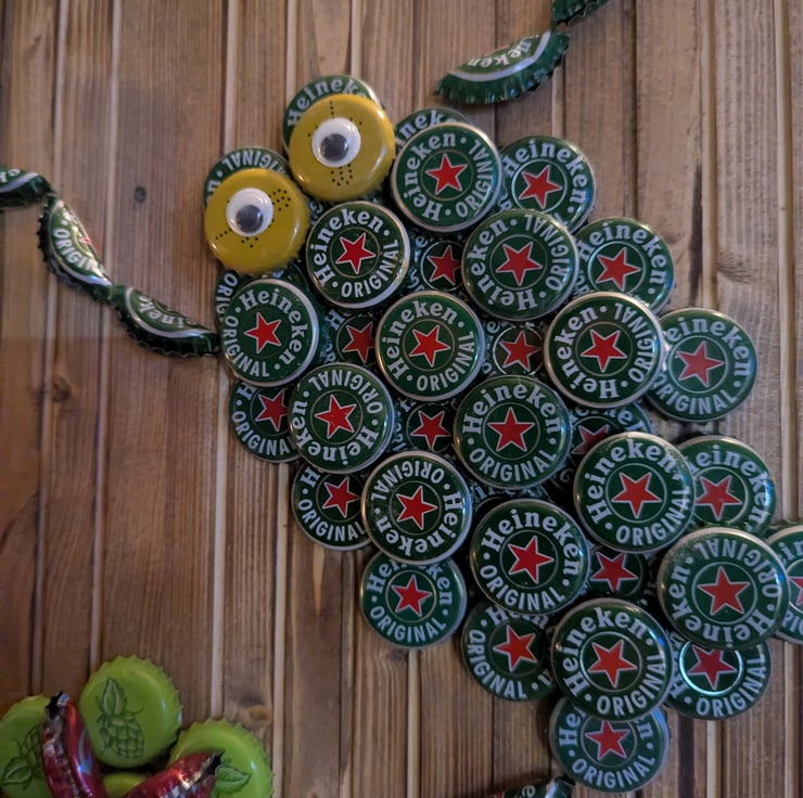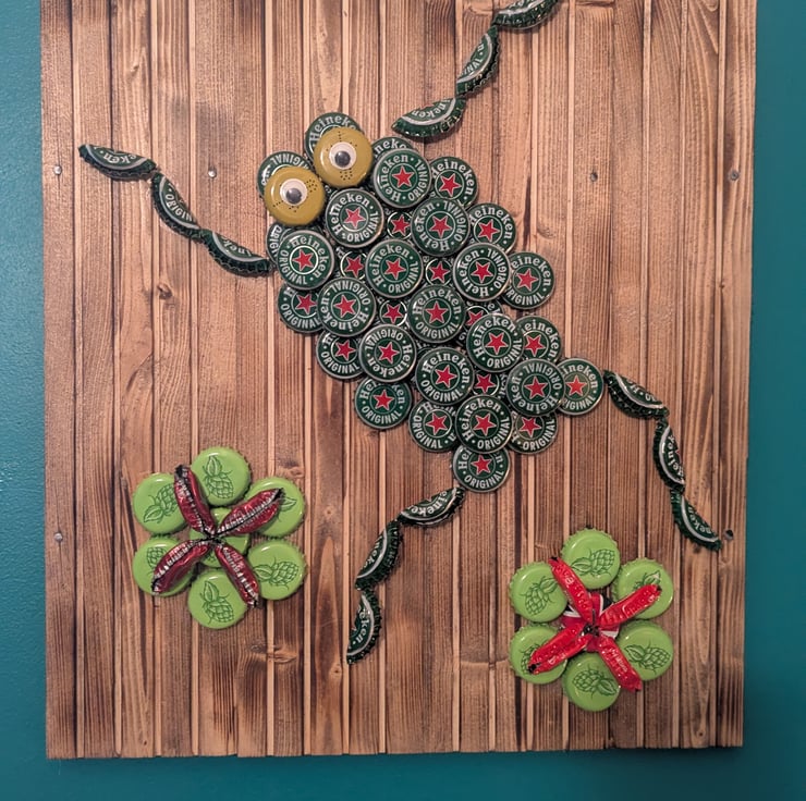 Upcycled Heineken beer bottle frog on aged wood background, measures 13 inches wide by 25 inches tall .