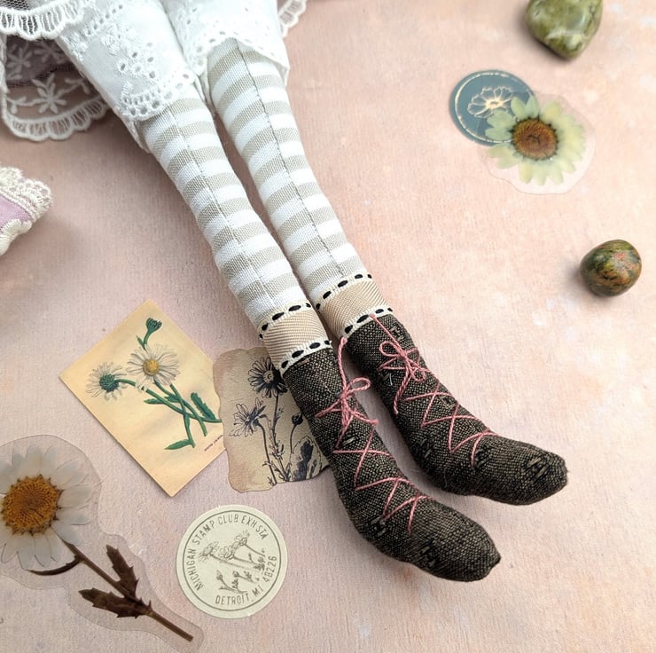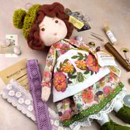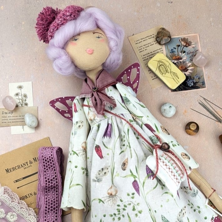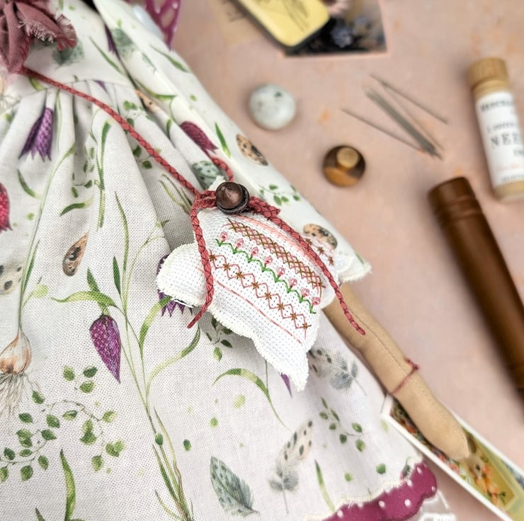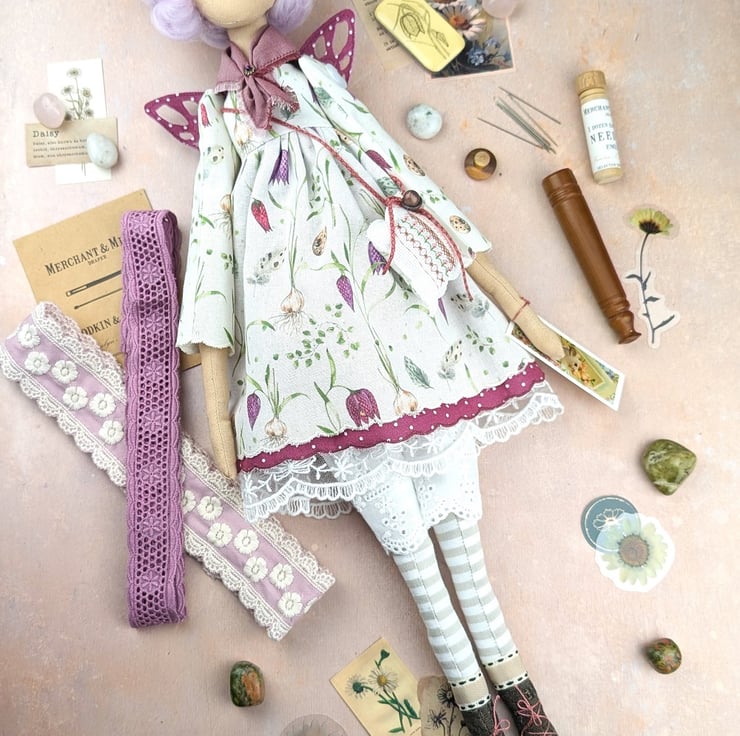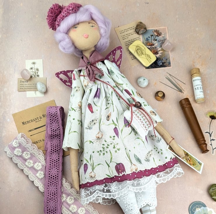 Ava is a cloth doll made with a tea dyed calico body and a hand embroidered face. She is made to my own pattern. She has hand stitched and styled wool tops for hair in a warm pale rose colour. She sports a very jaunty plum coloured crochet hat with a pompom in Rowan Yarn. Her dress is an Acufactum cotton print called Fritillaries in a white green ground witt Fritillary flowers and quail eggs abounding. She has co-ordinating underskirt & knickers with a white tulle petticoat. She has tiny tattered wings and a plum cotton scarf with a little sampler pillow. She stands 50cm tall and has a tiny waist with a plump bottom and she has button joints for her arms, To her heart she has a piece of rose quartz. She will sit nicely on a chair or a bed.